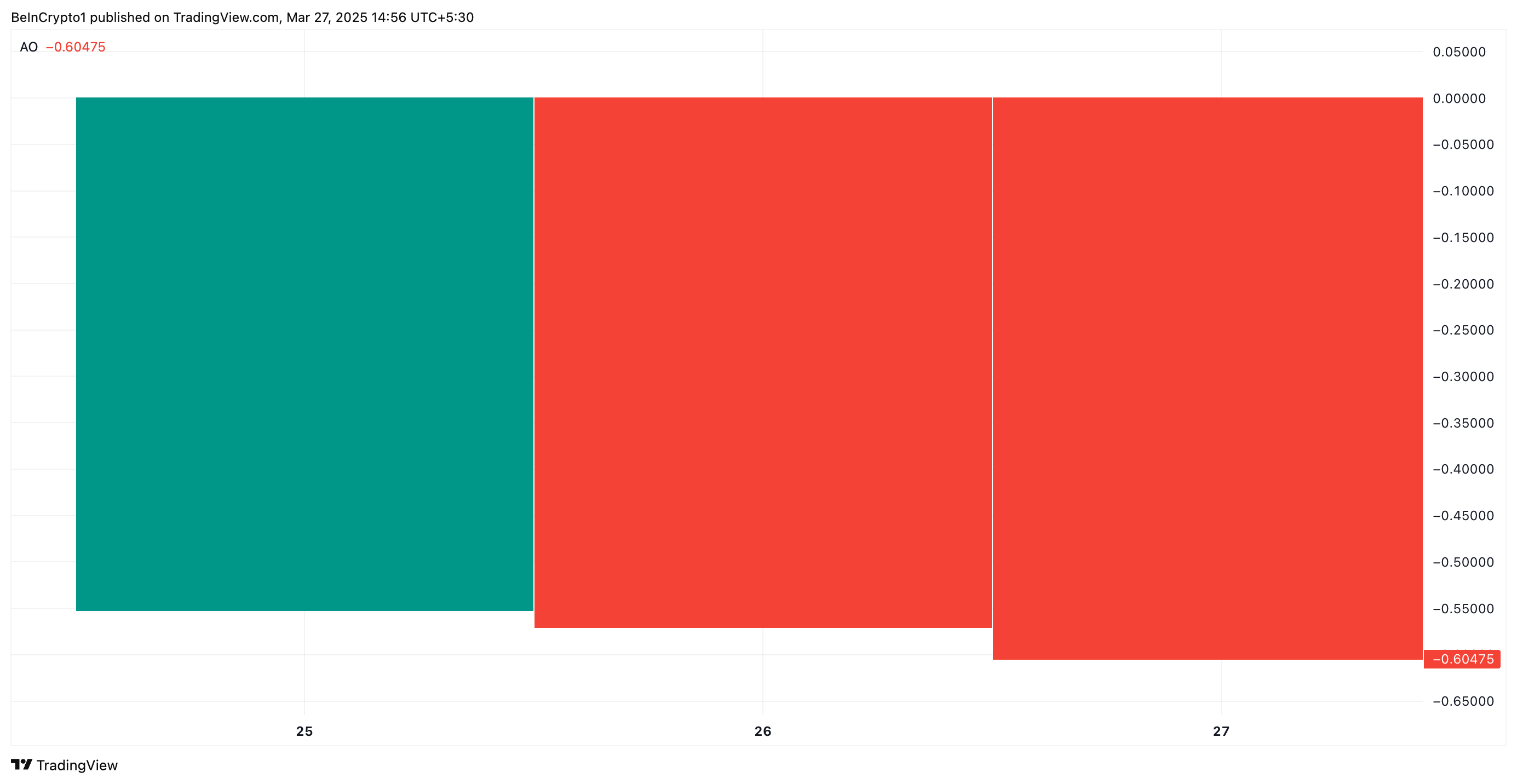 عندما يعيد مؤشر AO شريطًا أحمر، تكون قيمة الرسم البياني الحالية أقل من السابقة، مما يشير إلى زيادة في الضغط الهبوطي. يستخدم المتداولون هذا كتحذير مبكر للخروج من المراكز الطويلة أو الاستعداد لانعكاس محتمل في السوق.