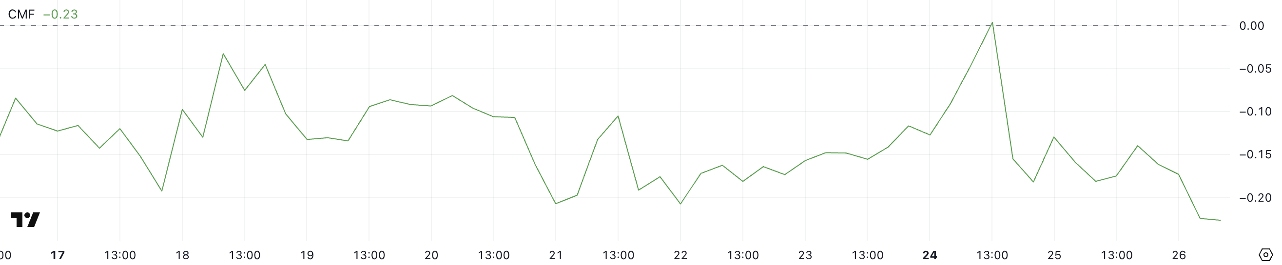 حاليًا، مؤشر تدفق المال تشايكين (CMF) لشبكة باي عند -0,23، وهو انخفاض ملحوظ من 0 قبل يومين فقط. CMF هو مؤشر مرجح بالحجم يقيس ضغط الشراء والبيع على مدى فترة محددة، عادة 20 أو 21 يومًا.