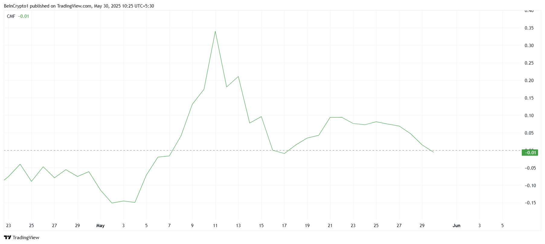 يكشف مؤشر تدفق المال تشايكين (CMF) عن ارتفاع التدفقات الخارجة لشبكة باي نتورك، مما يشير إلى تزايد بيع المستثمرين. حاليًا، يقع CMF قليلاً تحت خط الصفر، مما يشير إلى أن حجم البيع يتفوق على ضغط الشراء. إذا استمر الاتجاه، فقد يشير إلى تراجع الثقة والقناعة بين الحاملين.
