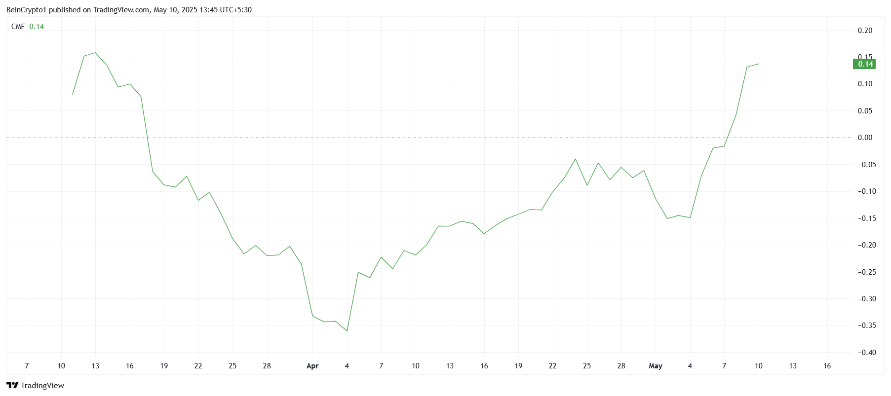 يتم دعم الزخم الكلي لشبكة باي نتورك أيضًا من خلال مؤشر تدفق المال تشايكين (CMF)، الذي يظهر ارتفاعًا حادًا. وهذا يشير إلى أن باي تشهد تدفقات قوية، حيث يحاول المستثمرون الاستفادة من البيئة الصاعدة الحالية.
