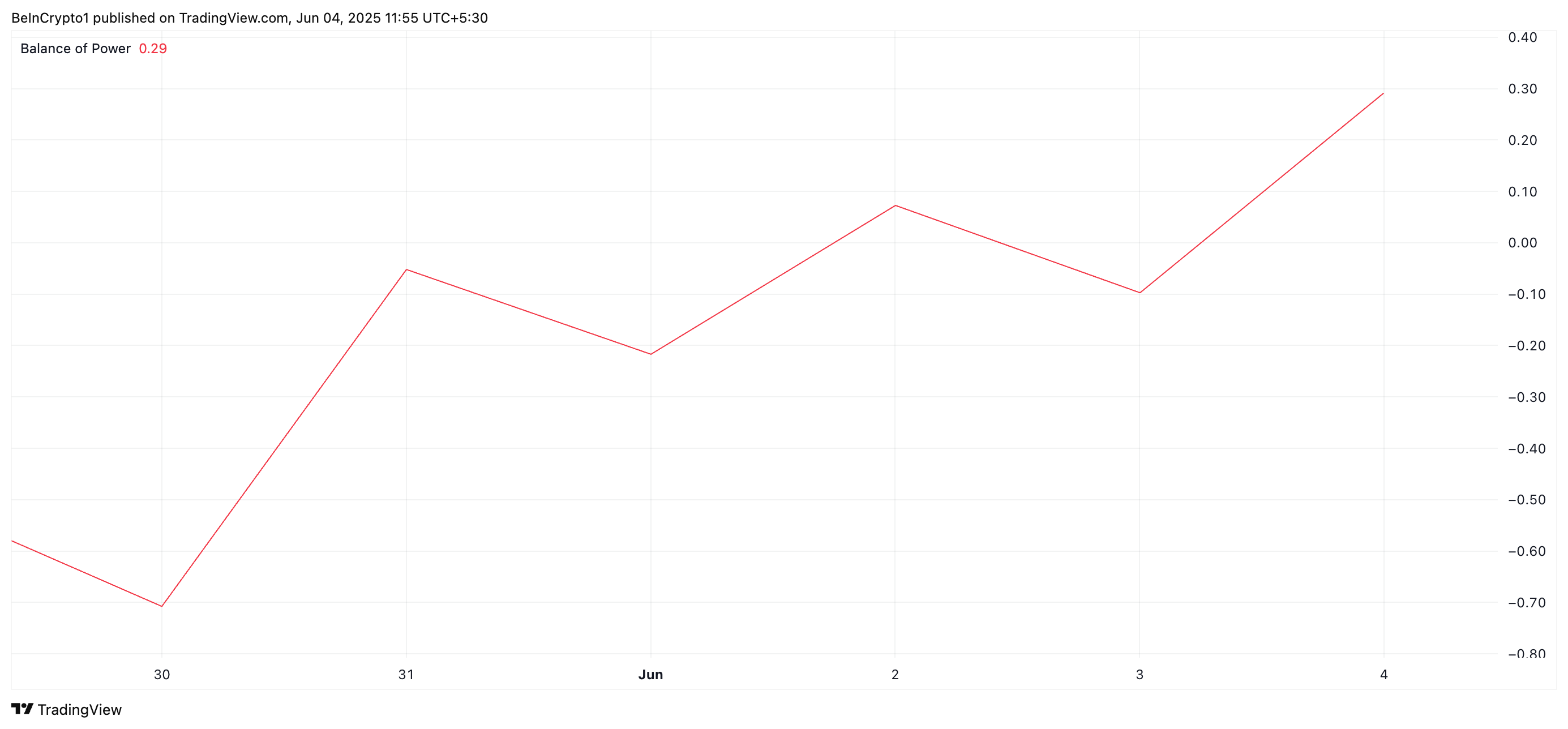 يقيس مؤشر BoP الفارق بين ضغط الشراء وضغط البيع على مدى زمني محدد. وعندما يعكس قراءة إيجابية، يكون المشترون في موقع السيطرة. ويشير ذلك إلى ارتفاع وتيرة التراكم في سوق PI، بما قد يمهّد لارتفاعات مستقبلية على المدى القريب إلى المتوسط.
