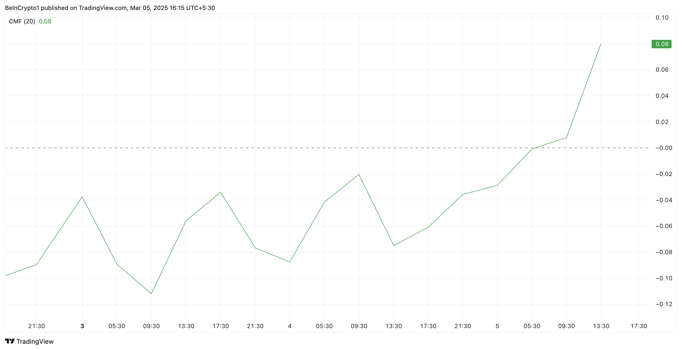 علاوة على ذلك، يؤكد تدفق المال تشايكين (CMF) لـ PI الزيادة في الطلب على العملة. هذا المؤشر، الذي يقيس تدفقات الأموال إلى وخارج الأصل، يقع فوق خط الصفر عند 0,08.