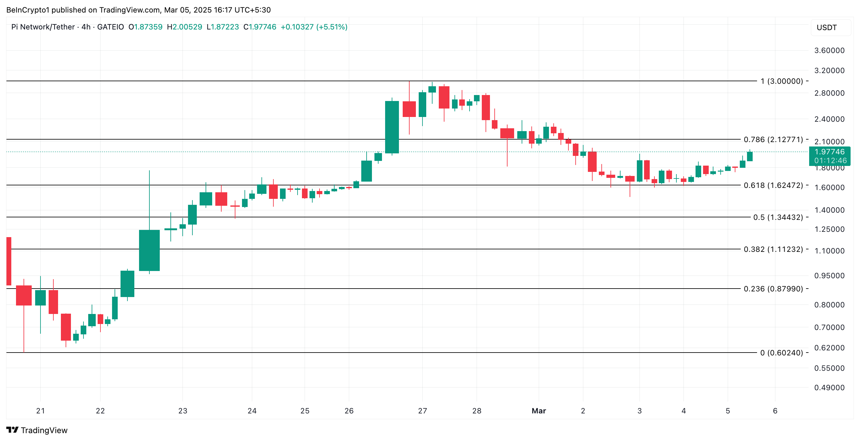على الرسم البياني لأربع ساعات، يحتفظ PI حاليًا فوق الدعم عند $1,97. إذا زادت الطلبات، يمكن أن يكسر العملة البديلة المقاومة عند $2,12 ويستعيد أعلى مستوى له على الإطلاق عند $3.