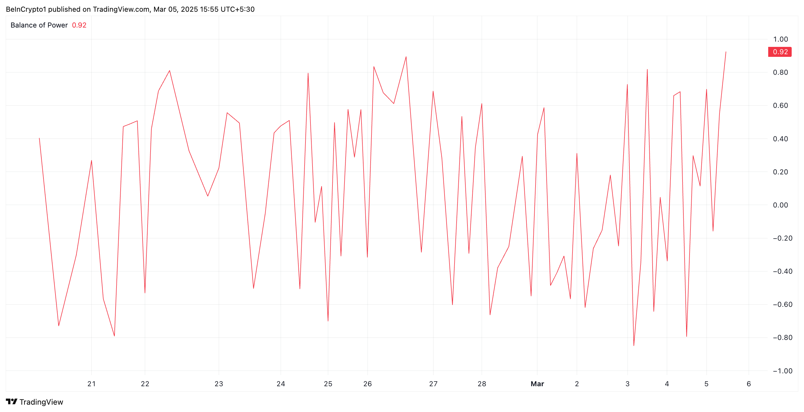 يقيس BoP للأصل قوة المشترين والبائعين من خلال تحليل تحركات السعر خلال فترة معينة. عندما تكون قيمته إيجابية، فإنه يشير إلى أن المشترين في السيطرة، مما يدفع الأسعار للأعلى.