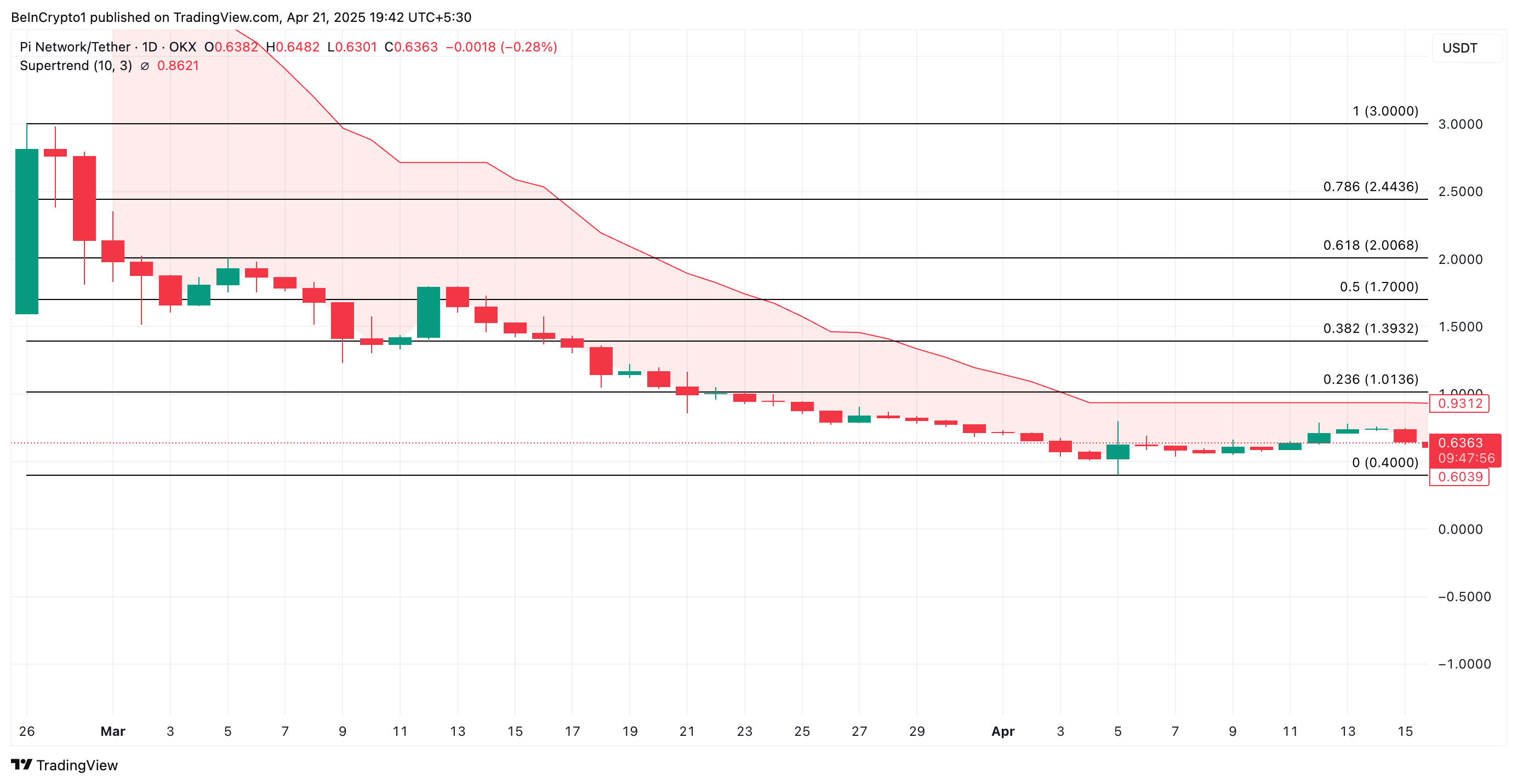 في وقت النشر، يتم تداول PI عند $0,63، أقل من الدعم الديناميكي الذي تشكل فوقه عند $0,93 بواسطة مؤشر Super Trend الخاص به.