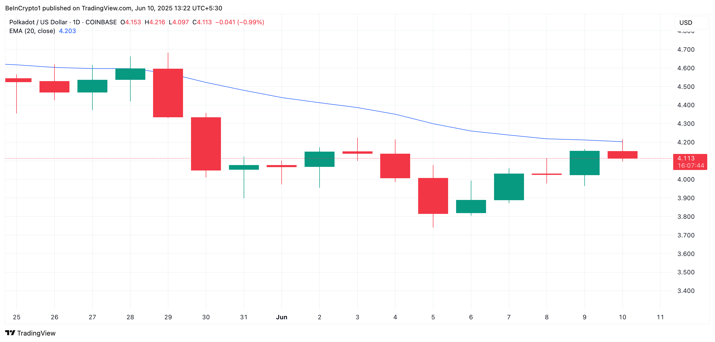 ومع ذلك، فإن قرارًا غير مواتٍ من هيئة الأوراق المالية والبورصات غدًا قد يهز ثقة المستثمرين ويثير عمليات بيع. قد يؤدي ذلك إلى انخفاض سعر دوت نحو مستوى $3,96.
