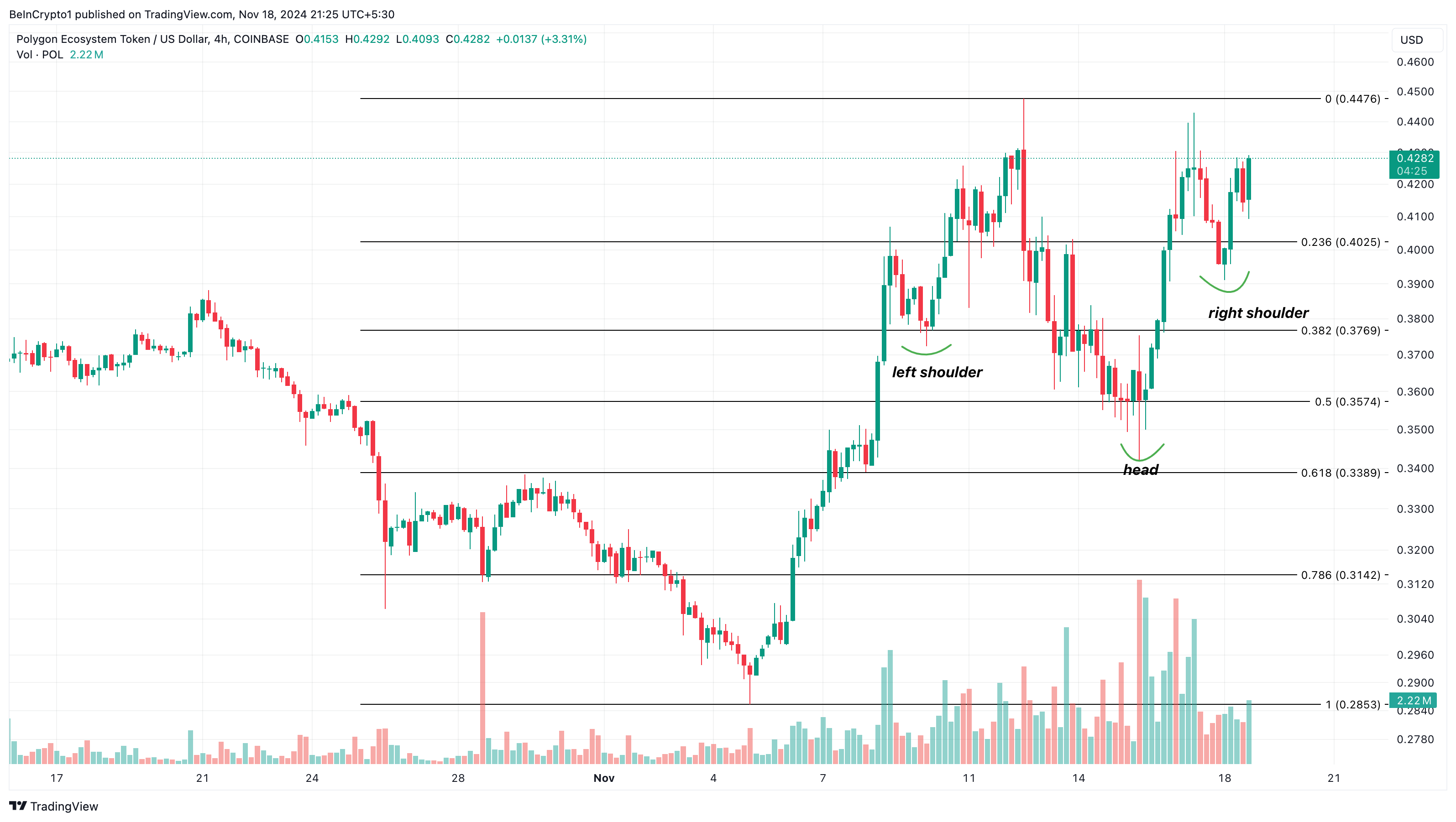 يظهر النظر إلى الإطار الزمني لأربع ساعات أن رسم POL/USD قد شكل نمط رأس وكتفين معكوس. نمط الرأس والكتفين المعكوس هو نمط فني يشير إلى احتمالية الانعكاس من اتجاه هابط إلى اتجاه صاعد.