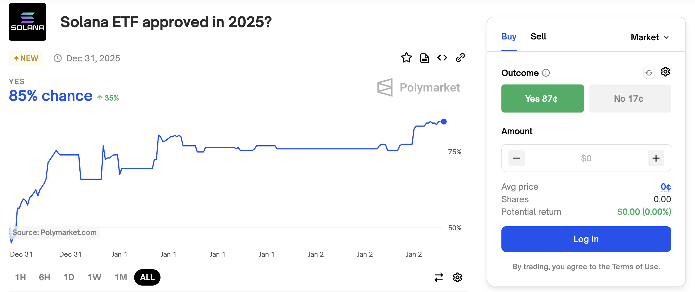 تدعي احتمالات بوليماركت، سوق التوقعات الشهير، أن هناك فرصة بنسبة 85% أن يحصل صندوق تداول سولانا على موافقة هيئة الأوراق المالية والبورصات هذا العام. في سبتمبر الماضي، أعطت نفس المنصة فرصة ضئيلة بنسبة 3%، مما يظهر الثقة الجديدة الجذرية في أن الموافقة ستتم.