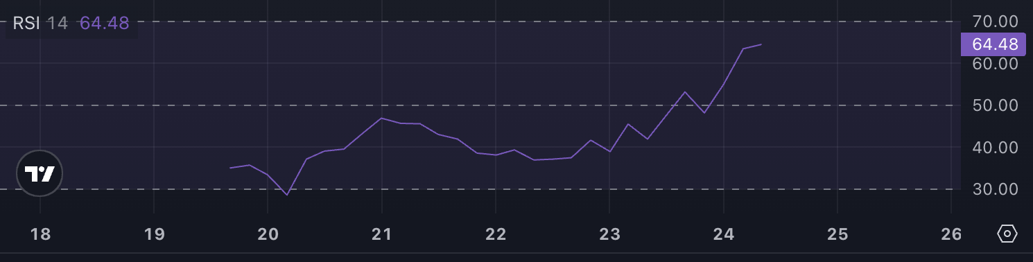 PENGU مؤشر القوة النسبية (RSI) يقف حاليًا عند 64,4، وهو أعلى قيمة منذ إطلاقه. يشير هذا RSI المرتفع إلى زخم شراء قوي، مما يوحي بأن الرمز قد شهد ضغطًا صعوديًا كبيرًا.