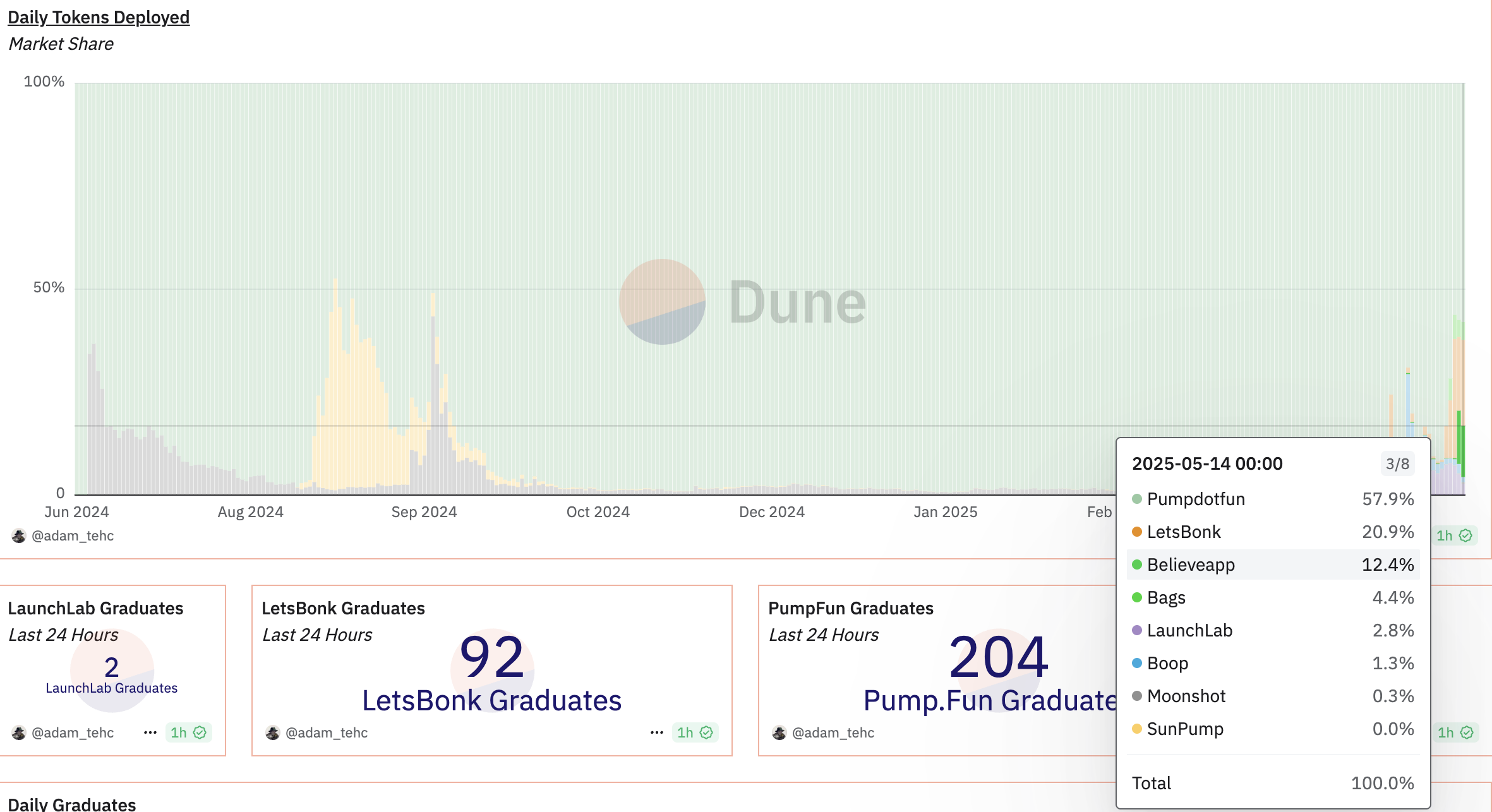 يوضح الرسم البياني من Dune Analytics بوضوح هذا التحول. بدأت منصات مثل LetsBonk وBelieve في اكتساب الزخم منذ أوائل عام 2025، خاصة من مارس، عندما أصبح سوق عملات الميم أكثر نشاطًا.
