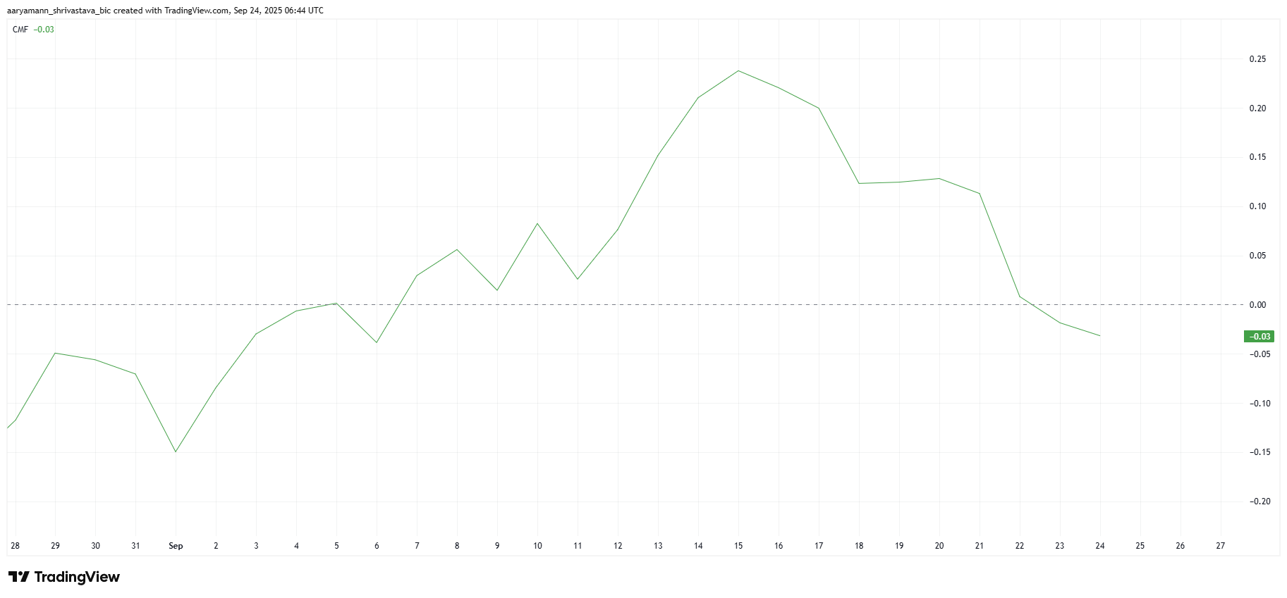تشير الصورة الأوسع للزخم أيضًا إلى ضعف لـ PUMP. يتجه مؤشر تدفق المال تشايكين (CMF)، الذي يتتبع تدفقات رأس المال الداخلة والخارجة، حاليًا نحو الانخفاض. يُظهر هذا أن المستثمرين يسحبون الأموال من الأصل، مما يزيد من ضغط البيع.