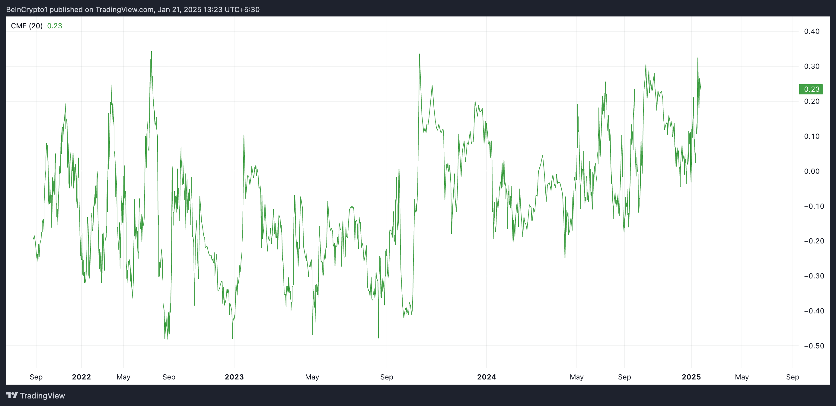 يتتبع هذا المؤشر الزخم كيف يتدفق المال إلى داخل وخارج الأصل. كما هو الحال مع عملة RAY، عندما تكون قيمته إيجابية، يسيطر ضغط الشراء على الأسواق الفورية. يشير ذلك إلى تراكم بين المشاركين في السوق ويشير إلى استمرار الاتجاه الصعودي في سعر الأصل.