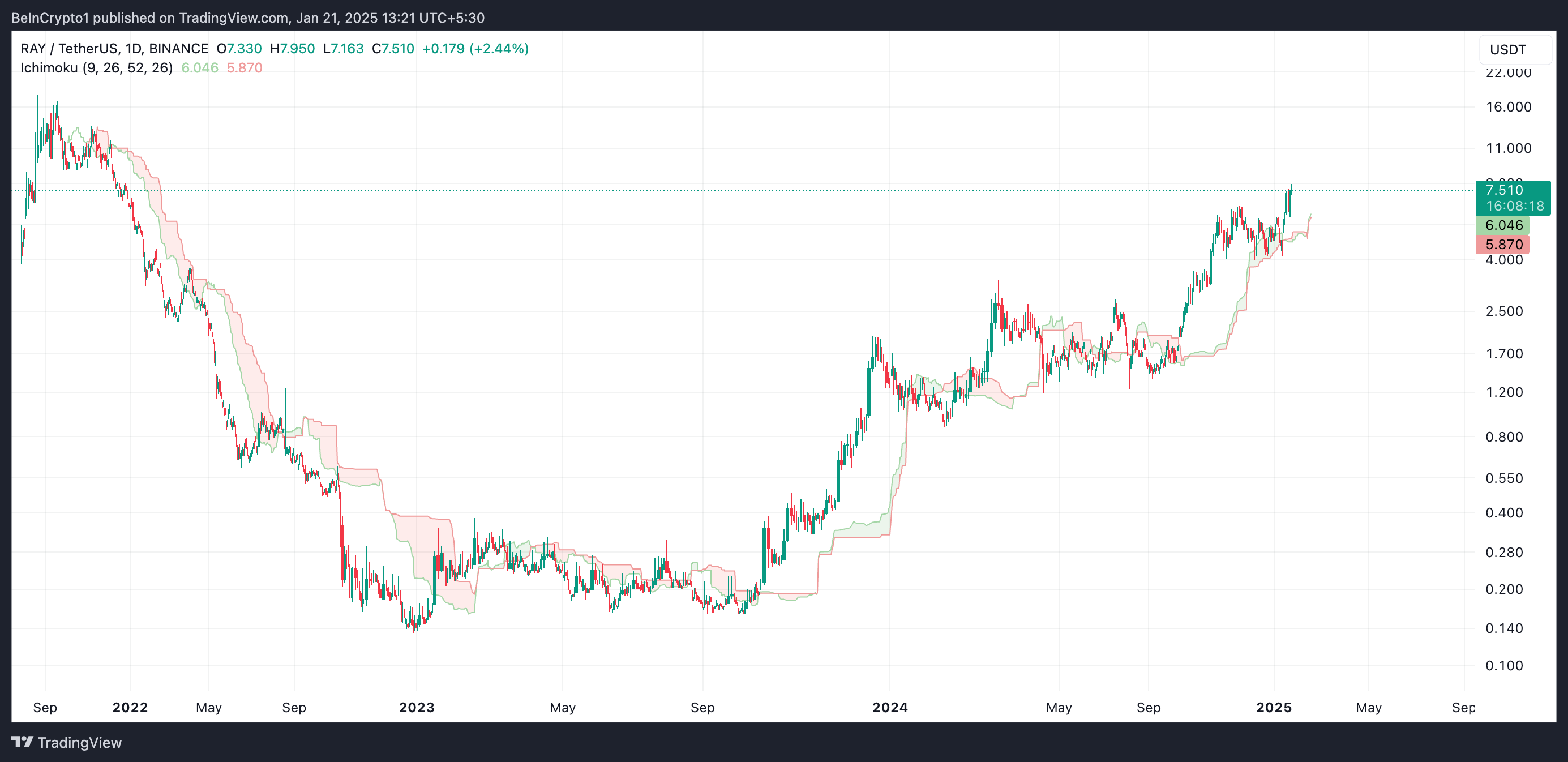 يكشف تقييم الرسم البياني ليوم واحد لـ RAY/USD عن زيادة في الطلب على العملة البديلة. يتضح ذلك من خلال إعداد سحابة إيشيموكو الخاصة بها. حيث تشكل الأسبان الرائدة A وB دعمًا ديناميكيًا تحت سعر الرمز عند 6,04$ و5,87$ على التوالي.