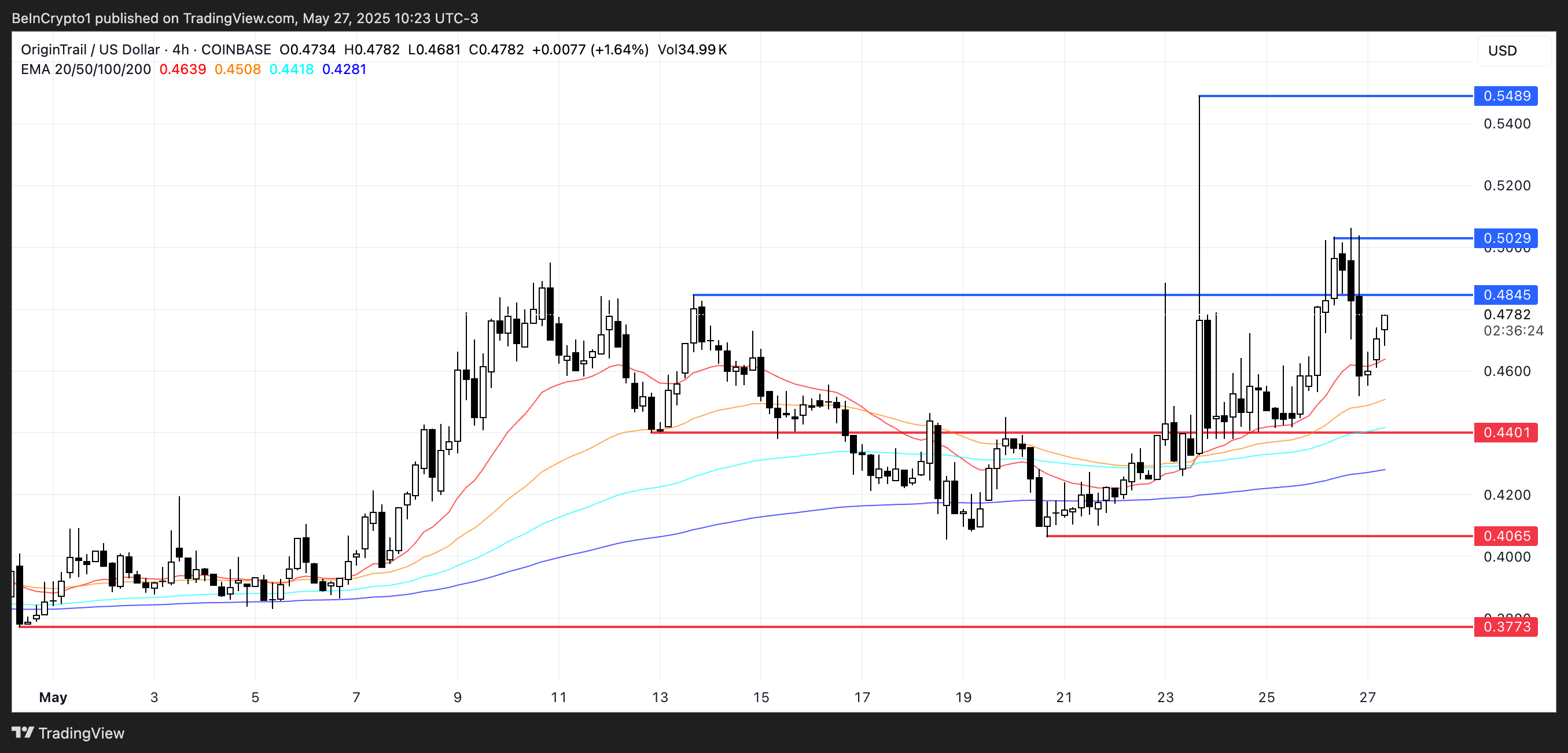 من منظور تقني، TRAC يقترب من مستويات مقاومة هامة عند $0,48 و$0,502. يمكن أن يؤدي اختراق ناجح فوق هذه النقاط إلى تمهيد الطريق للتحرك نحو $0,548.