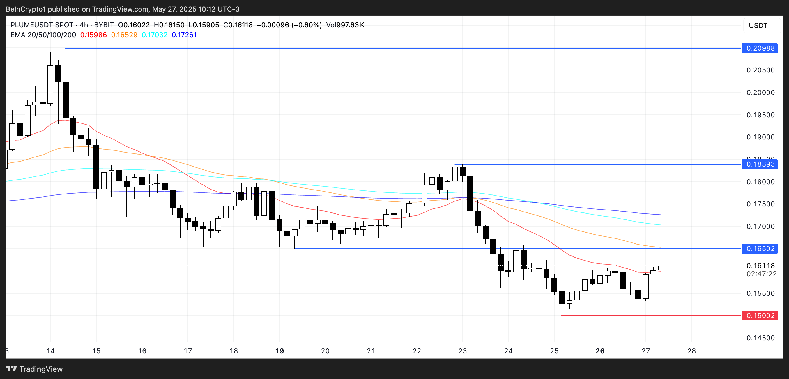 إذا استمر التصحيح الحالي، يمكن أن ينزلق PLUME لاختبار الدعم عند $0,15، وكسر تحت ذلك يمكن أن يفتح الباب لمزيد من الخسائر. ومع ذلك، إذا عاد الزخم الصعودي، يمكن أن يحاول الرمز استعادة $0,165.