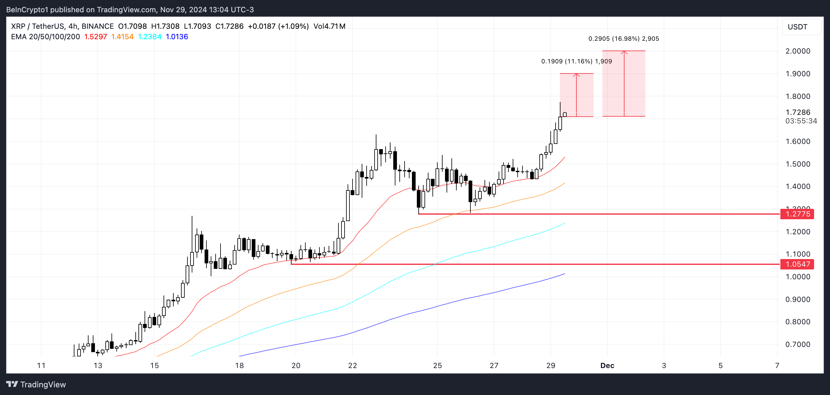 يتداول سعر ريبل عند أعلى مستوى له منذ عام 2018، بعد تحقيق مكاسب مثيرة بنسبة 231,39% خلال الـ30 يومًا الماضية. تُظهر خطوط EMA أن XRP حاليًا في اتجاه صعودي. إذا استمر ذلك، يمكن أن يصل XRP إلى 1,90 دولار، بزيادة قدرها 11%، وحتى اختبار 2 دولار، مما يمثل ارتفاعًا بنسبة 16%.
