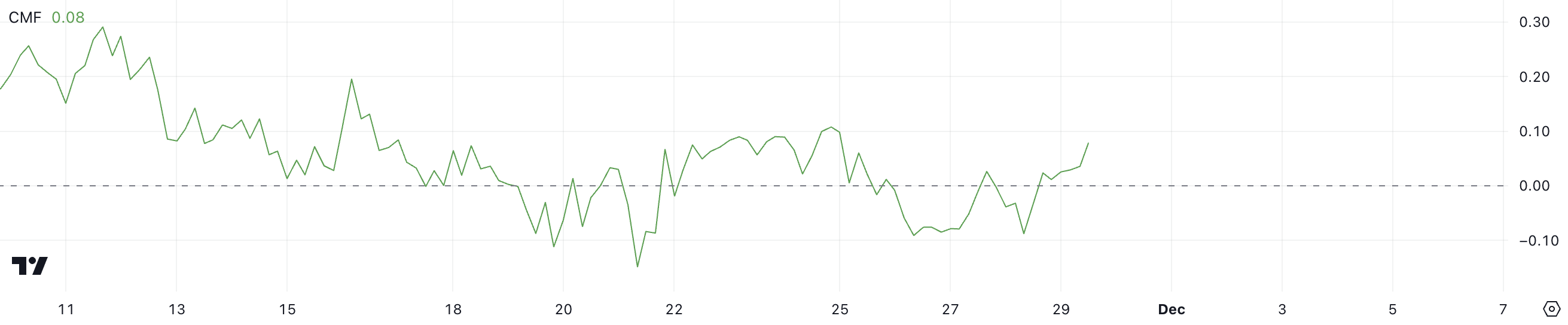 تشير القيم الإيجابية لـ CMF إلى تدفقات رأس المال الصافية وضغط الشراء، بينما تشير القيم السلبية إلى التدفقات الخارجة وهيمنة البيع. يبرز الانتقال إلى المنطقة الإيجابية الثقة المتزايدة بين المشترين ويدعم الزخم السعري الأخير.