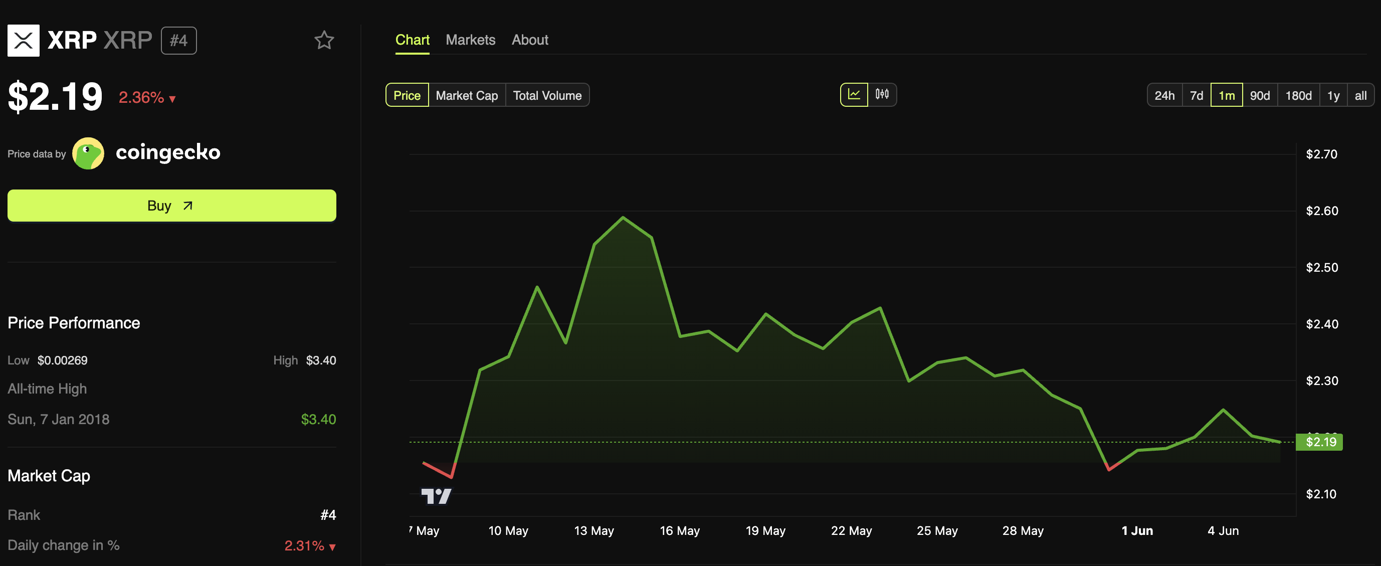 في وقت كتابة هذا التقرير، كان سعر تداول XRP هو $2,19، يمثل انخفاضًا بنسبة 2,36% خلال الـ 24 ساعة الماضية.