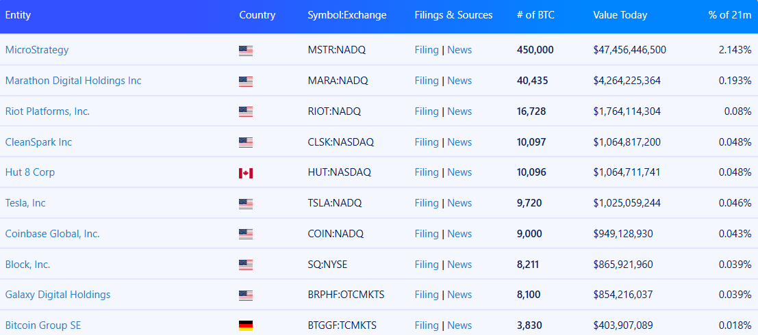 بشكل عام، تظل مايكروستراتيجي، إلى حد بعيد، أكبر حامل لـBTC بين الشركات المدرجة علنًا. ارتفع سهمها بأكثر من 700% العام الماضي، مدفوعًا بعمليات الاستحواذ العدوانية على بيتكوين. أُضيفت الشركة أيضًا إلى ناسداك-100 بسبب هذا النمو الملحوظ.