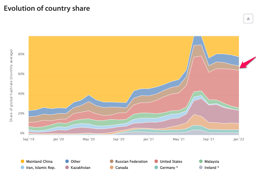وفقًا لـبيانات من جامعة كامبريدج، يمثل تعدين بيتكوين في روسيا 4,7% من الهاشريت العالمي، بانخفاض من 11% في أغسطس 2021. في الوقت نفسه، يحتفظ المعدنون في الولايات المتحدة بأكبر حصة من الهاشريت العالمي بنسبة 37,8%.