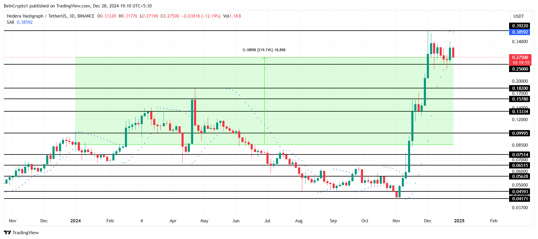 شهدت HBAR أداءً مميزًا في الربع الرابع من 2024، حيث قادت معظم نموها خلال الأشهر الأخيرة من العام. أدى أداء العملة البديلة إلى زيادة بنسبة 219% منذ بداية العام، مما رفع سعرها إلى $0,275. يبرز هذا النمو الكبير اهتمام المستثمرين القوي وزخم السوق.