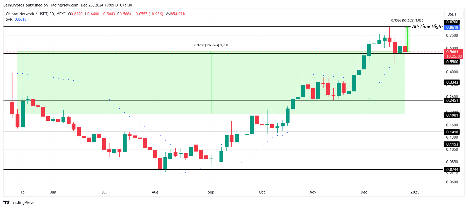 شهد CHEX نموًا ملحوظًا بنسبة 192% هذا العام لكنه لا يزال أقل بنسبة 53% من أعلى مستوى له على الإطلاق (ATH) عند 0,87$. زاد الاهتمام بشبكة Chintai بين عشاق التشفير خلال الأشهر القليلة الماضية، مما وضع العملة البديلة كواحدة يجب مراقبتها في السوق.