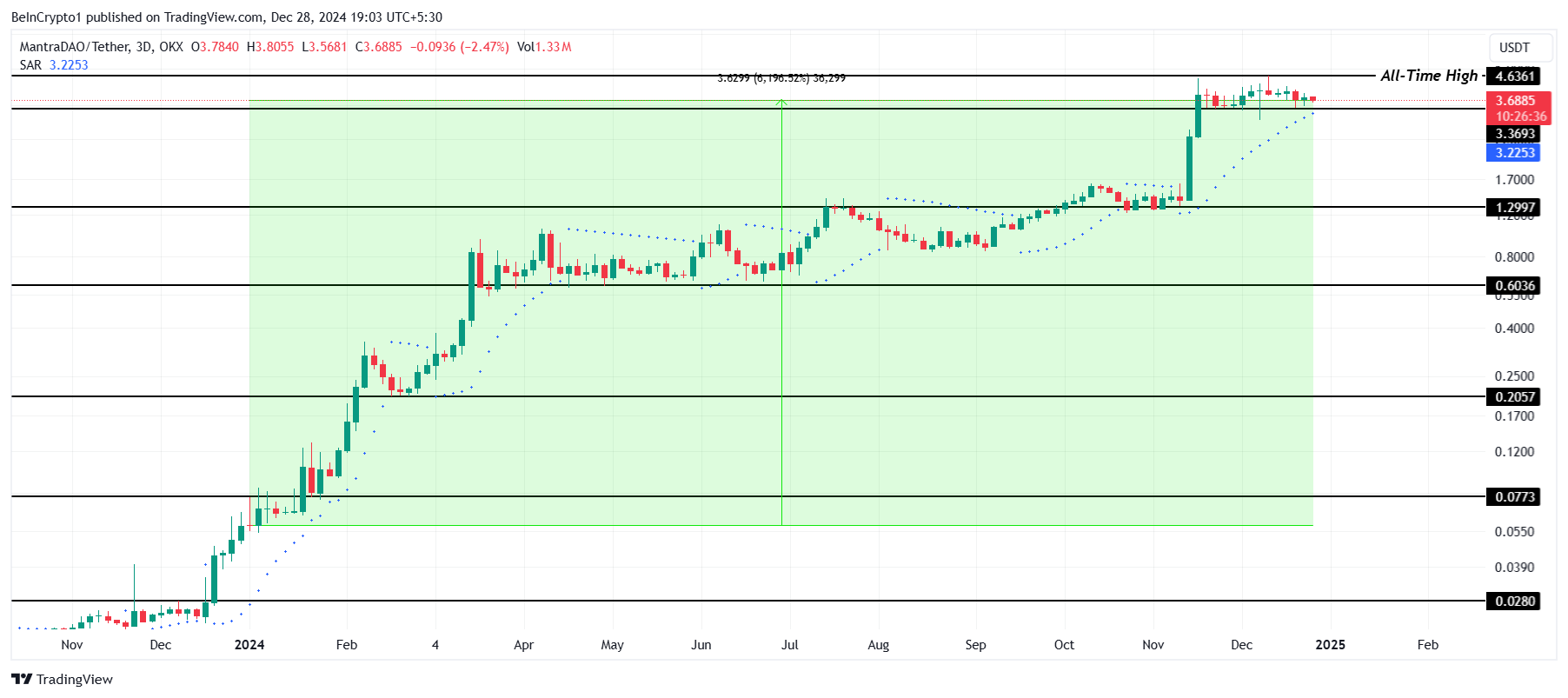 يشكل جني الأرباح خطرًا كبيرًا على النظرة الصعودية لـ OM. قد يؤدي الانخفاض إلى ما دون مستوى الدعم الحرج 3,36$ إلى دفع السعر إلى 1,29$. سيؤدي هذا الانخفاض إلى إبطال احتمال تحقيق ATH جديد، مما يبرز أهمية الحفاظ على مناطق الدعم الرئيسية للحفاظ على ثقة المستثمرين.