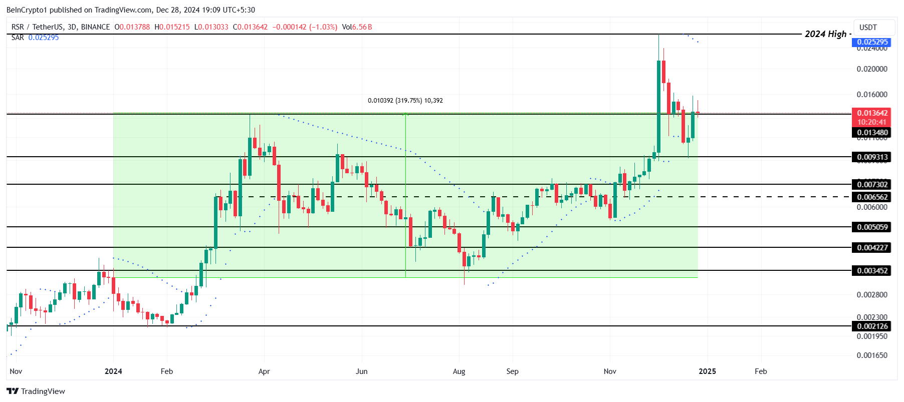 شهدت RSR ارتفاعًا ملحوظًا بنسبة 319% هذا العام، حيث يتم تداولها حاليًا عند $0,013. ومع ذلك، لا تزال أقل من أعلى مستوى لها في 2024 عند $0,025. بينما قد تواجه العملة البديلة تحديات في 2025، تواصل التميز كرمز RWA رائد، مما يجذب اهتمام المستثمرين.