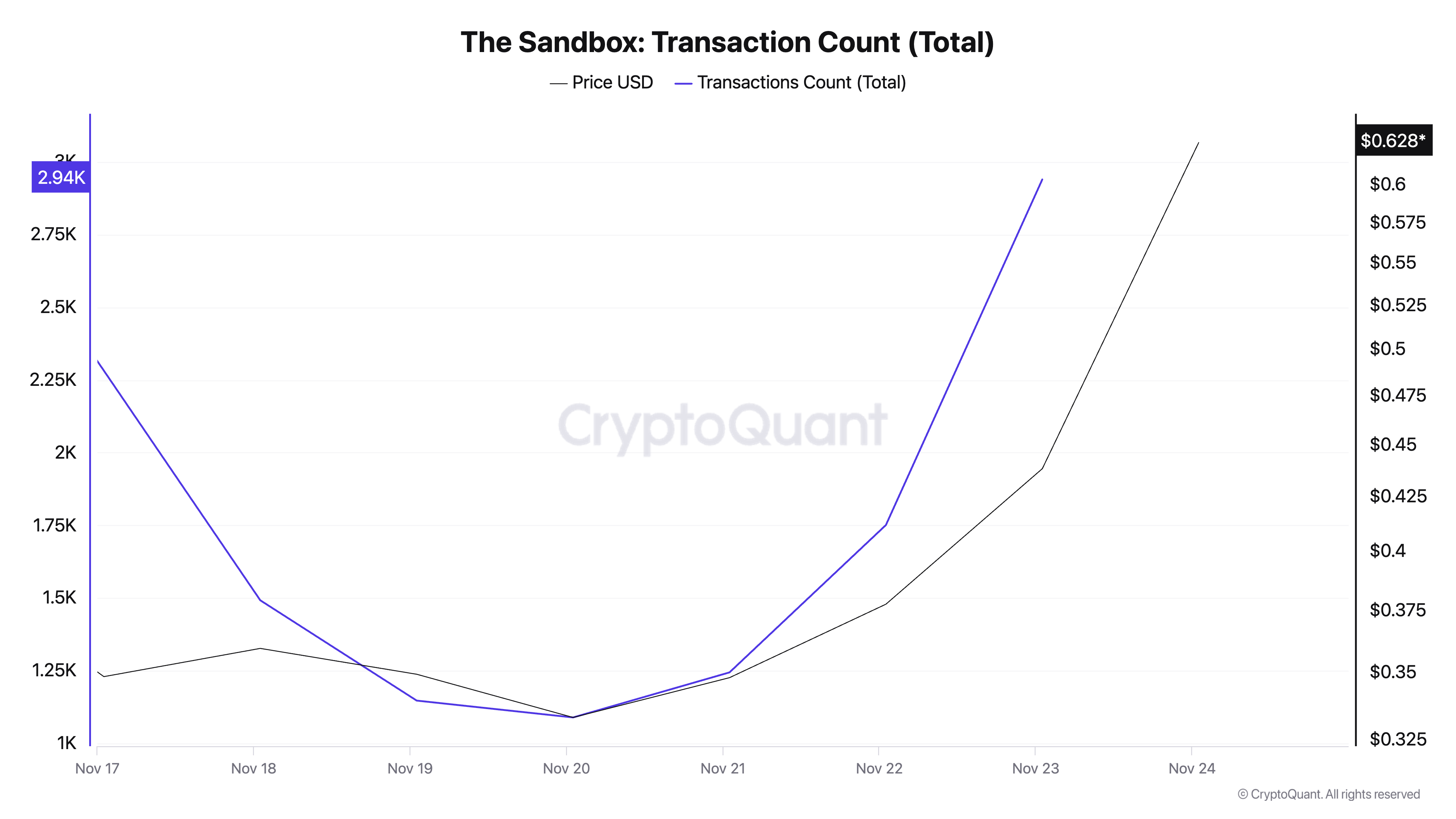 وفقًا لبيانات CryptoQuant، عدد معاملات SAND اليومية قد ارتفع بشكل كبير خلال الأيام القليلة الماضية. للمقارنة، في 23 نوفمبر، تم إكمال 2,940 معاملة تتعلق بـ SAND، وهو العدد الأعلى خلال الأيام السبعة الماضية.