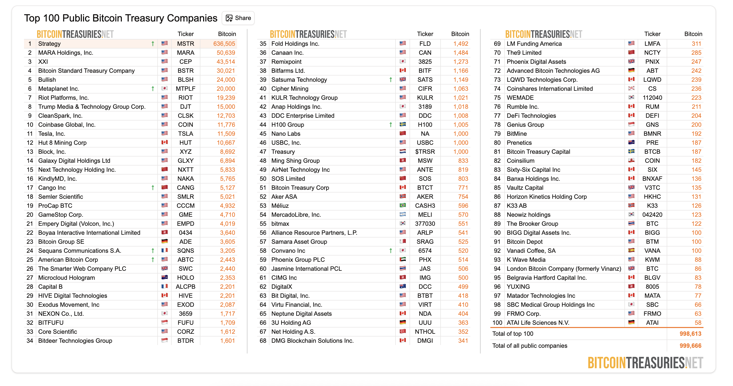 تواصل الشركات العامة والخزائن التراكم. تحتفظ أكبر 100 شركة خزينة بيتكوين عامة، بما في ذلك أمثال MicroStrategy، بشكل جماعي بـ 998,613 بيتكوين. على إيثريوم، كشفت Sharplink Gaming عن حيازات 837,230 إيثريوم اعتبارًا من 31 أغسطس. وأسماء كبيرة أخرى مثل Bitmine موجودة أيضًا عندما يتعلق الأمر بابتلاع إمدادات إيثريوم.
