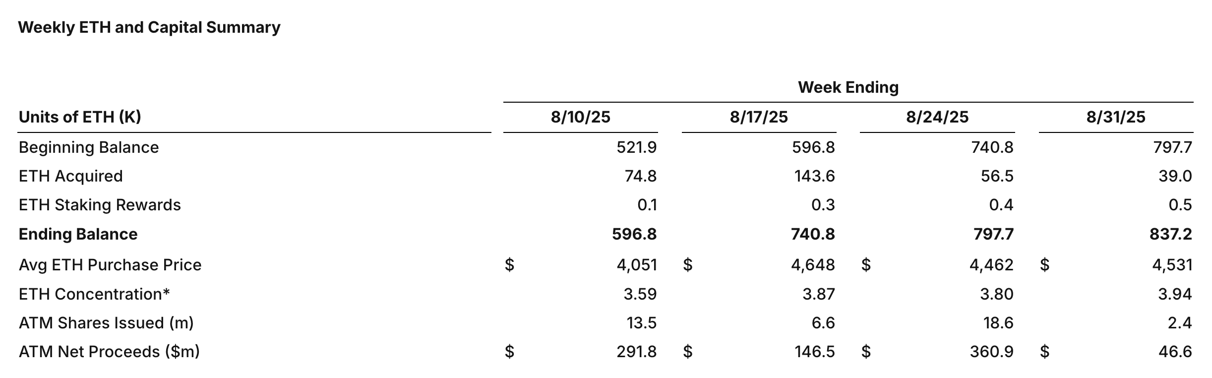 اشترت شركة SharpLink، التي تتخذ من مينيسوتا مقرًا لها، 39,008 إيثريوم بين 25 أغسطس و31 أغسطس بسعر متوسط قدره 4,531 دولار. تم تمويل هذه المشتريات جزئيًا من خلال 46,6 مليون دولار تم جمعها عبر برنامج الأسهم في السوق (ATM).