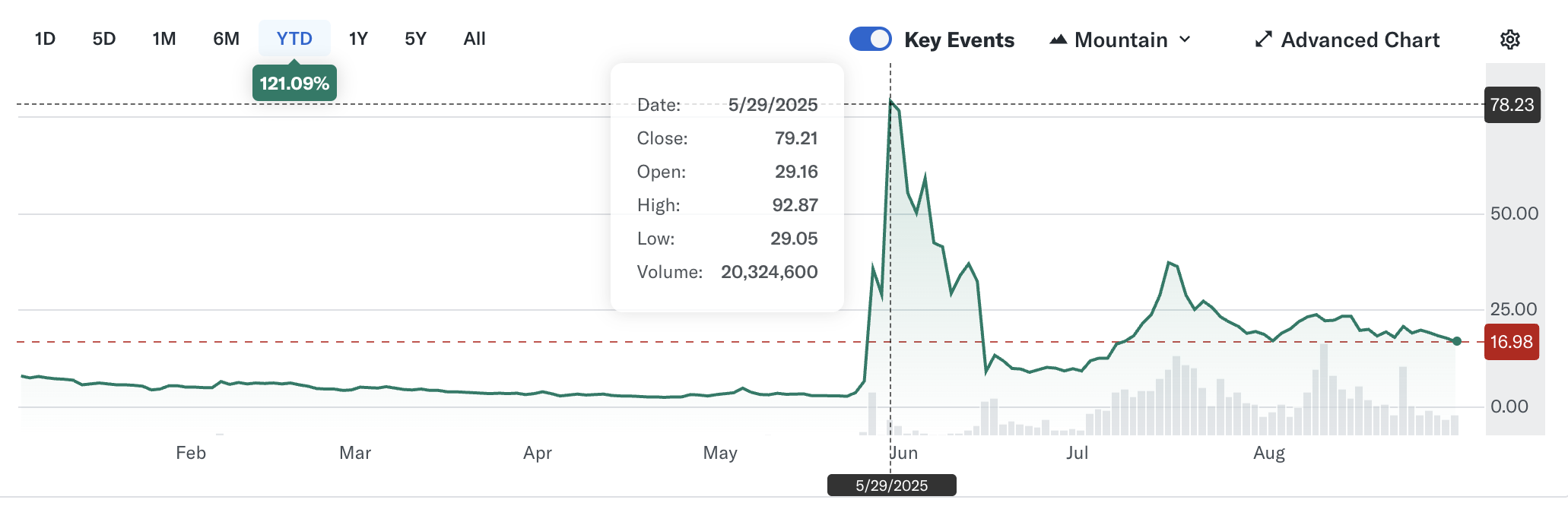 رغم شرائها العدواني، كانت أسهم SharpLink متقلبة. تم تداول SBET بسعر 16,98 دولار يوم الثلاثاء، بانخفاض يقارب 5% في اليوم، رغم أن الأسهم ارتفعت بأكثر من 400% منذ منتصف مايو، عندما تم تداولها بأقل من 3 دولارات.