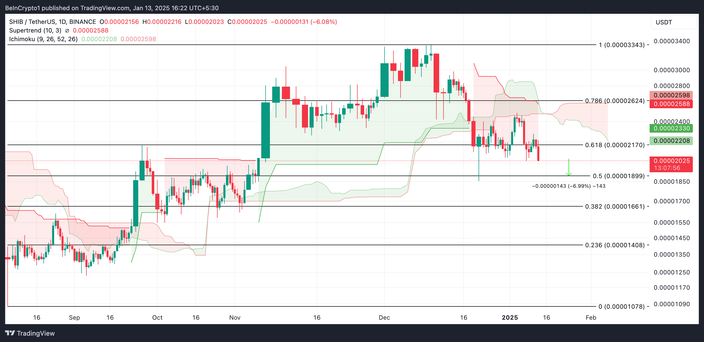رغم هذه الإشارات الإيجابية، قد تجعل المقاومة الهبوطية القوية ضد شيب من الصعب على العملة استعادة ارتفاعاتها السابقة. تظهر القراءات من مخططها ليوم واحد أن العملة الميمية لا تزال تتداول تحت سحابة إيشيموكو.
