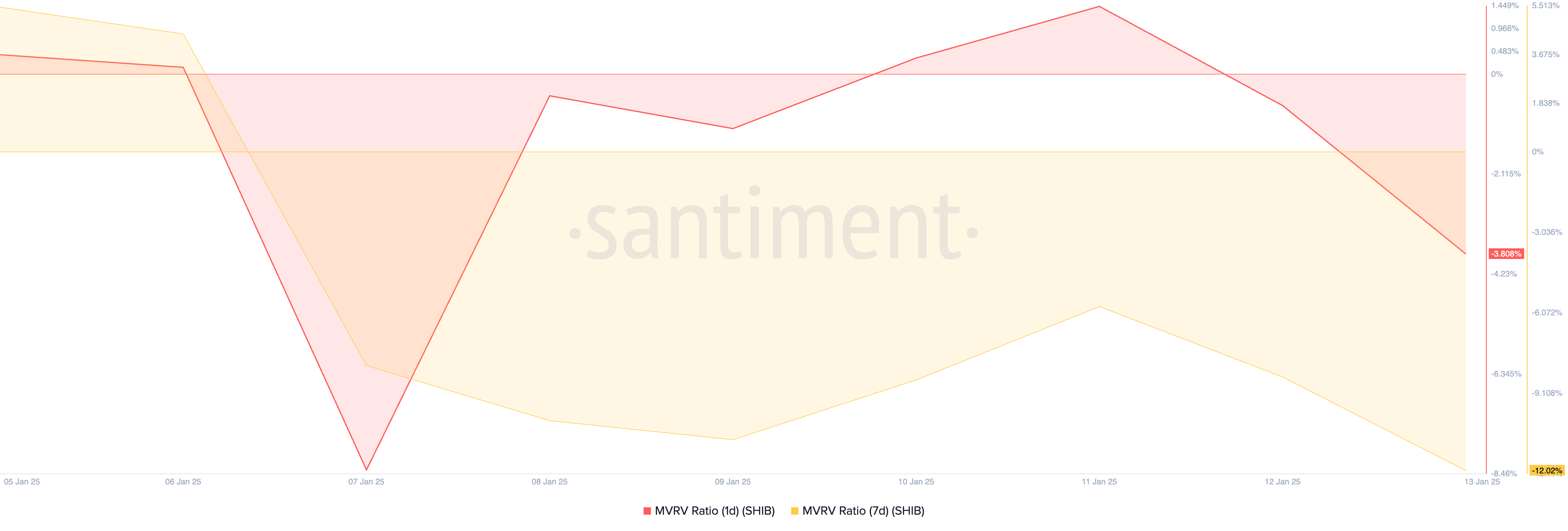 نسبة القيمة السوقية إلى القيمة المحققة لشيبا إينو (MVRV)، التي تقيم الربحية الإجمالية لحامليها، تشير إلى أن الرمز حاليًا مقيم بأقل من قيمته. تقف نسب MVRV ليوم واحد وسبعة أيام عند -3,80% و-12,02%، على التوالي، في وقت كتابة هذا التقرير.
