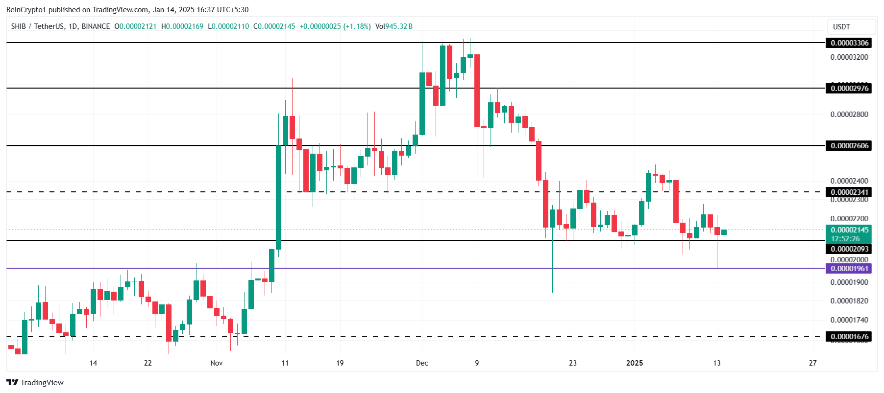 سعر شيبا إينو فوق $0,00002093. ومع ذلك، تشير المؤشرات الحالية إلى أن SHIB قد يفقد مستوى الدعم الحرج $0,00002093.