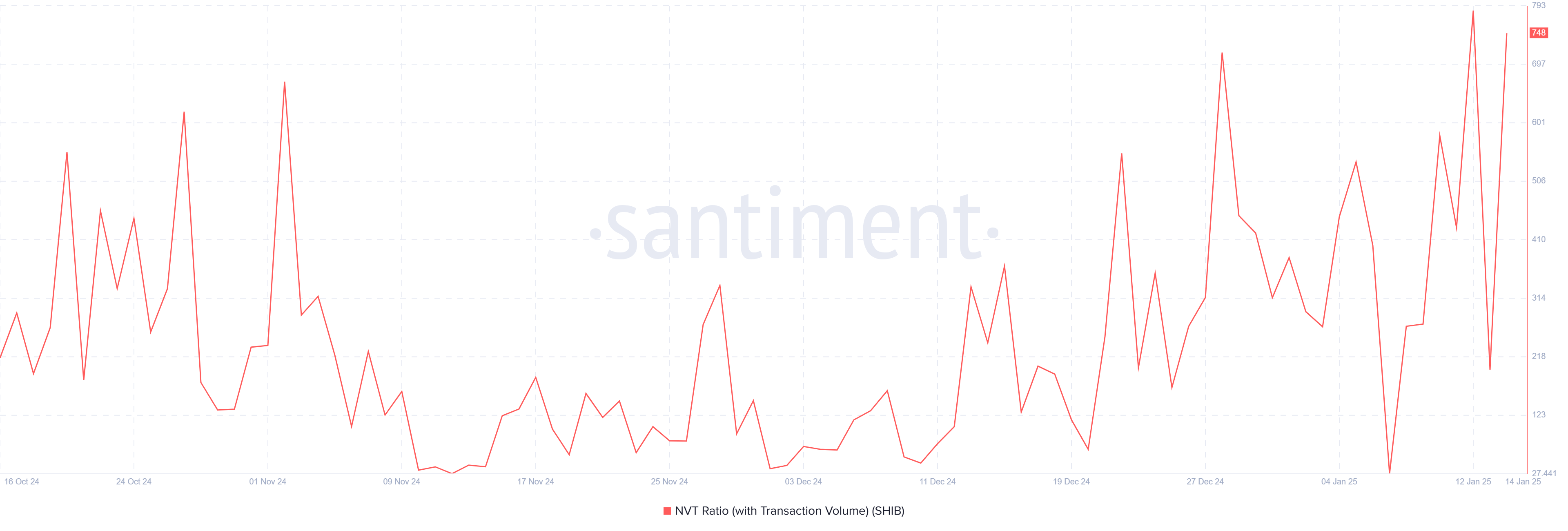نسبة قيمة شبكة شيبا إينو إلى المعاملات (NVT) كانت ترتفع باستمرار، مما يشير إلى احتمال زيادة التقييم. تقيس النسبة العلاقة بين قيمة الشبكة ونشاط المعاملات. عندما تتجاوز قيمة الشبكة بشكل كبير الاستخدام المعاملاتي، فإن ذلك غالبًا ما يشير إلى أن الأصل يتم تداوله بمستويات مبالغ فيها.
