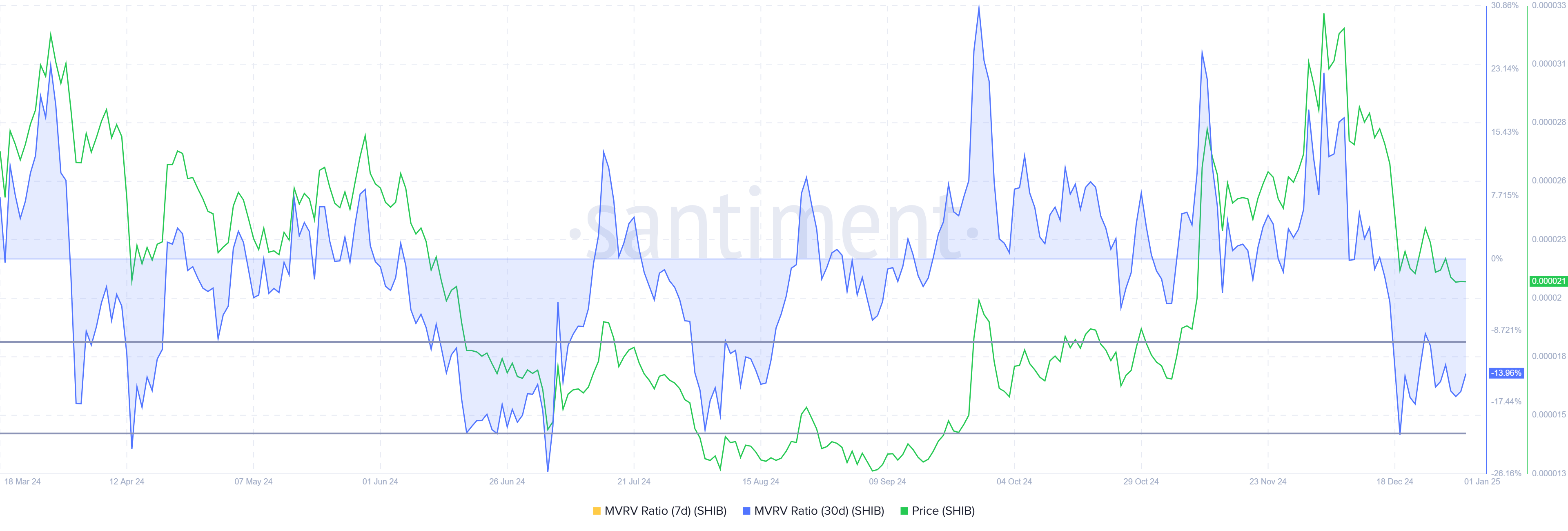 نسبة القيمة السوقية إلى القيمة المحققة (MVRV) لـشيبا إينو انخفضت إلى منطقة الفرصة، التي تقع بين -9% و-21%. تاريخيًا، تشير هذه المنطقة إلى انعكاسات سعرية محتملة، حيث تدفع المستثمرين عادةً للاحتفاظ بمراكزهم بدلاً من البيع. هذا السلوك يدعم التراكم عند مستويات سعرية منخفضة، مما يقلل من ضغط البيع.