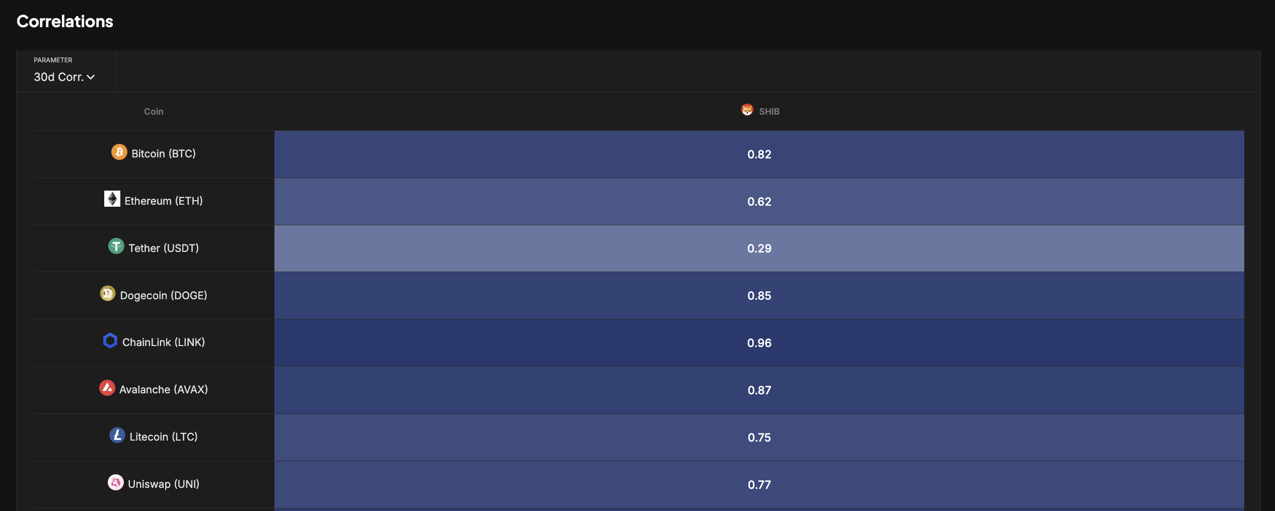 شيبا إينو يرتبط بقوة مع بيتكوين (BTC)، حاليًا بنسبة 0,82.