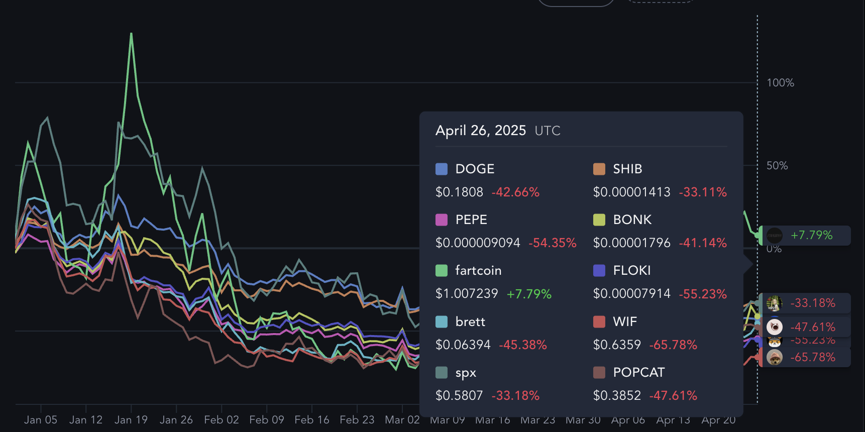شيبا إينو انخفض بنسبة 33,11%، لكنه أداءه كان أفضل قليلاً من العملات الميمية الرئيسية الأخرى مثل BONK، PEPE، وDOGE، التي عانت من تصحيحات أعمق.