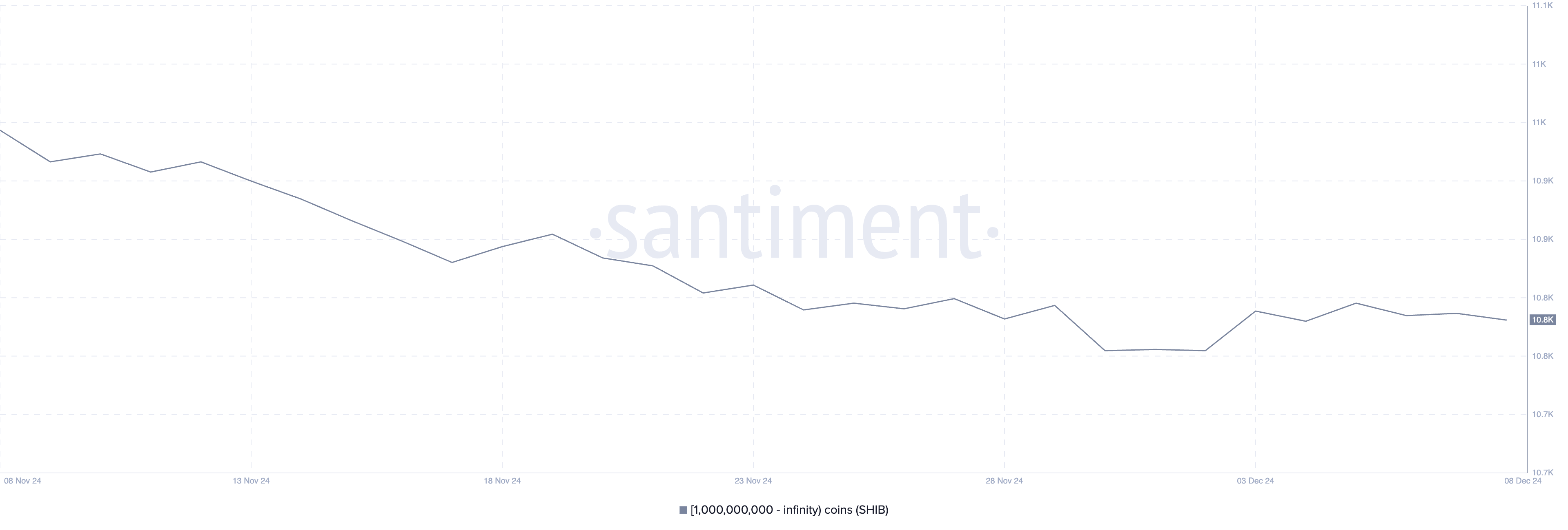 انخفض عدد العناوين التي تحتفظ بما لا يقل عن 1 مليار SHIB مؤخرًا، من 10,860 في 5 ديسمبر إلى 10,845 الآن.