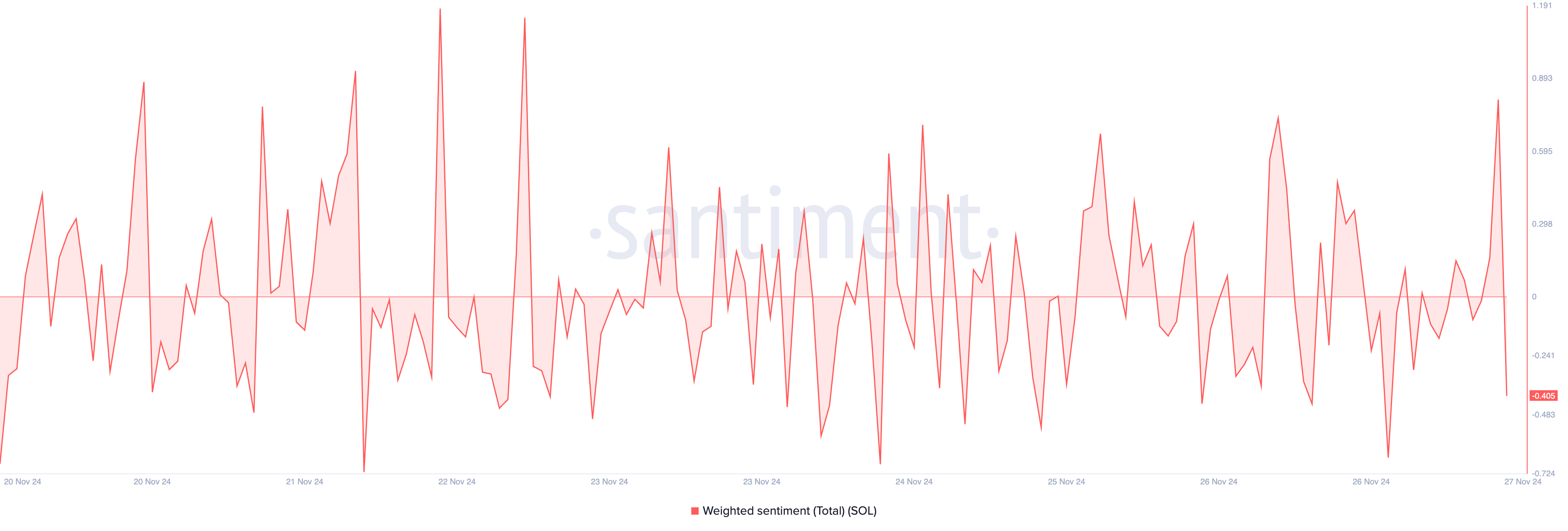 علاوة على ذلك، تؤكد المعنويات السلبية الموزونة لعملة سولانا هذا التحيز الهبوطي. حاليًا، تبلغ هذه القيمة -0.40.