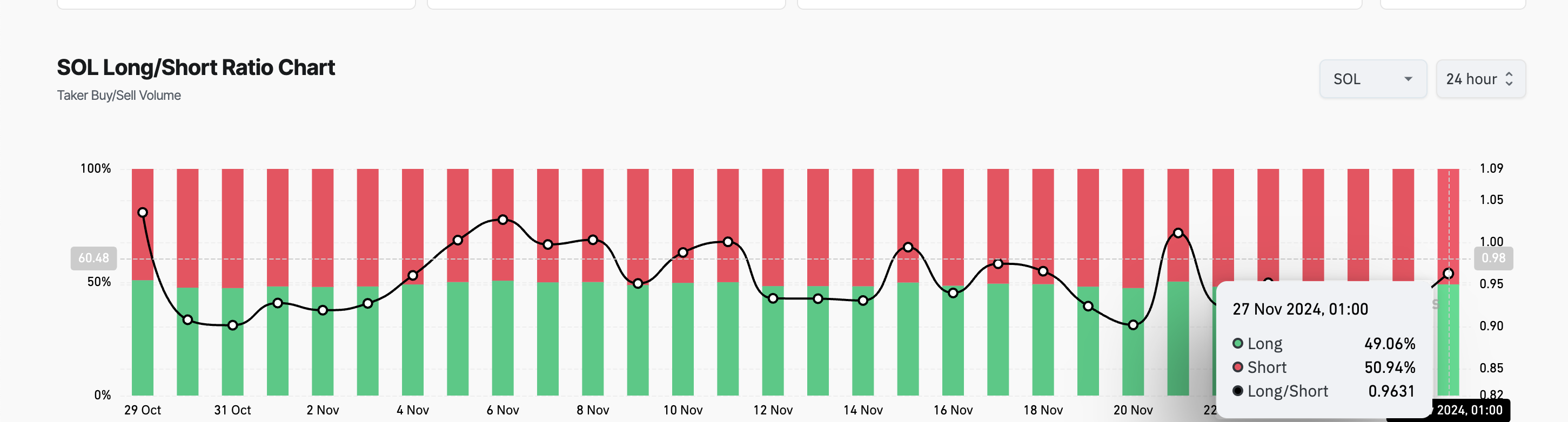 حاليًا، تبلغ نسبة الصفقات الطويلة إلى القصيرة (Long/Short Ratio) لعملة سولانا 0.96. تقيس هذه النسبة حجم الصفقات المفتوحة التي تراهن على ارتفاع السعر مقابل تلك التي تراهن على انخفاضه في السوق.