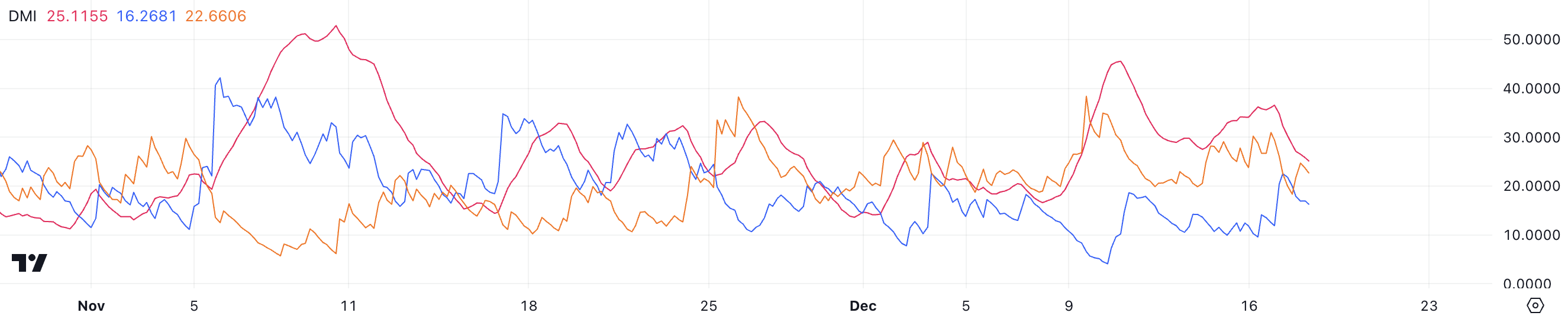 في حالة سولانا، تشير D+ عند 16,2 وD- عند 22,6 إلى أن الضغط الهبوطي يفوق حاليًا الزخم الصعودي. يشير هذا الخلل إلى مخاطر هبوط قصيرة الأجل لـ SOL ما لم يستعيد المشترون السيطرة ويدفعوا D+ فوق D-.