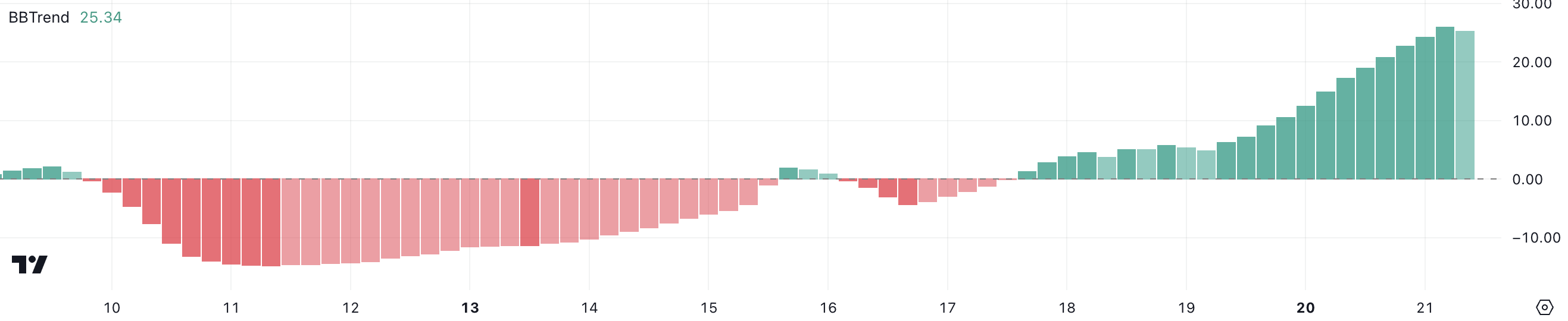 سولانا BBTrend حاليًا عند ٢٥,٣٤، منخفض قليلاً عن ذروته الأخيرة عند ٢٥,٩٩، وهو أعلى مستوى منذ ديسمبر ٢٠٢٣. يقيس BBTrend، أو اتجاه بولينجر باند، قوة السعر بالنسبة إلى النطاقات العليا والسفلى لبولينجر، مما يوفر رؤى حول التقلبات واتجاه الاتجاه. تشير قيمة BBTrend الإيجابية إلى زخم صعودي، بينما تشير القيم السلبية إلى زخم هبوطي.