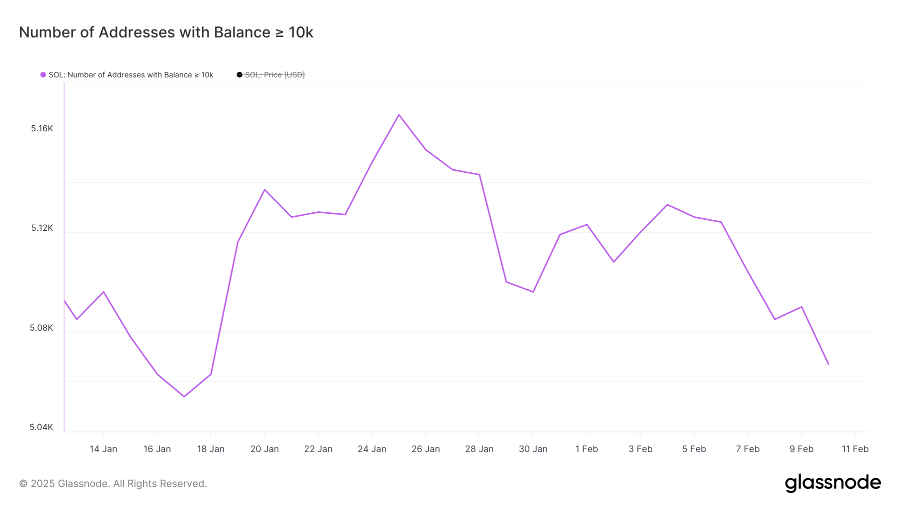 بلغ عدد حيتان سولانا - العناوين التي تحتوي على ما لا يقل عن 10000 SOL - ذروته عند أعلى مستوى له على الإطلاق عند 5167 في 25 يناير قبل أن يبدأ في الانخفاض. بينما كان هناك انتعاش قصير إلى 5131 في 4 فبراير، استمر العدد في الانخفاض، والآن يقف عند 5067.