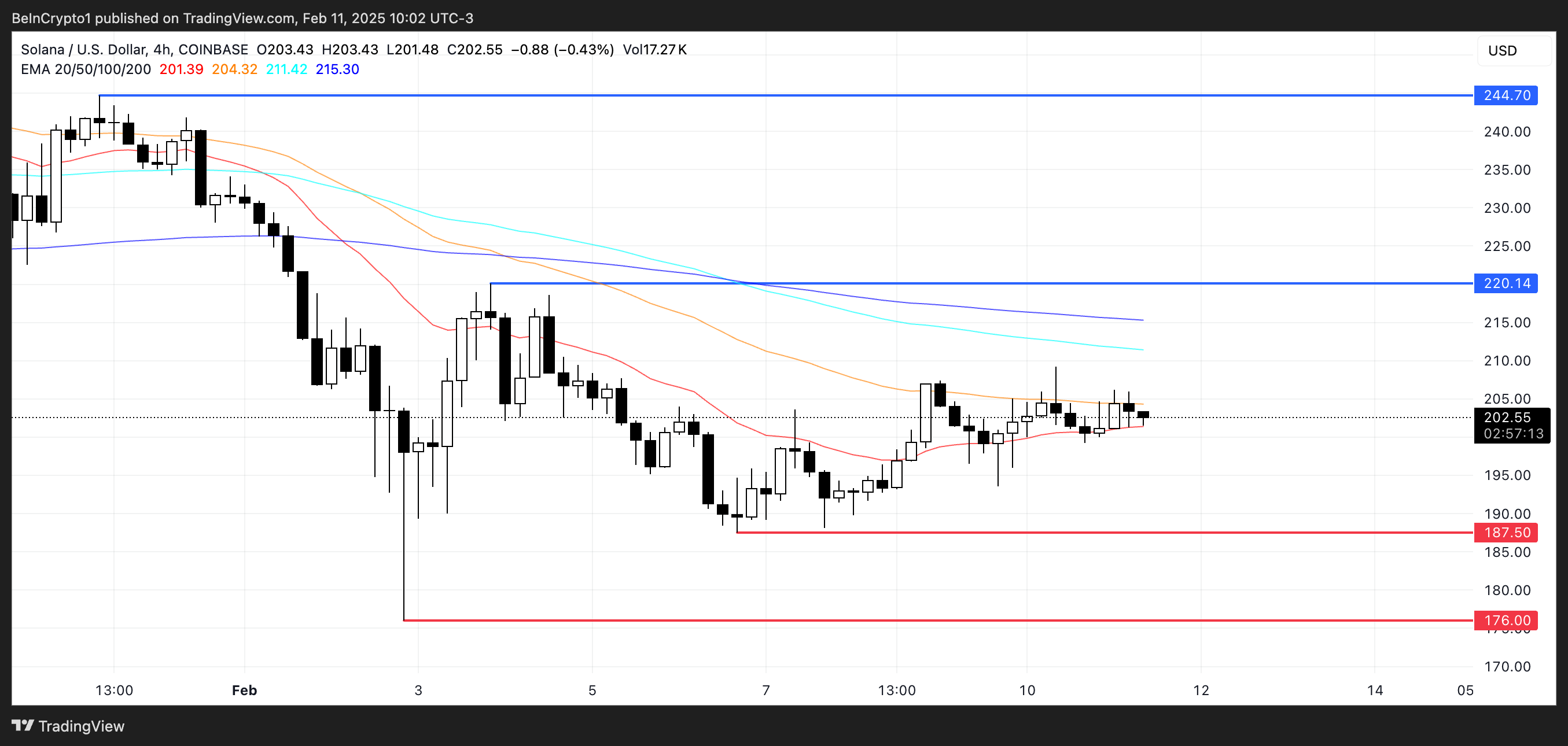 من ناحية أخرى، إذا ظهر اتجاه هبوطي وازداد قوة، يمكن أن يعيد سعر SOL اختبار دعمه الرئيسي عند 187$. يمكن أن يؤدي الكسر دون هذا المستوى إلى تعريض السعر لمزيد من الانخفاض، مع إمكانية الانخفاض إلى 176$، مما يمثل تصحيحًا بنسبة 12,5%.