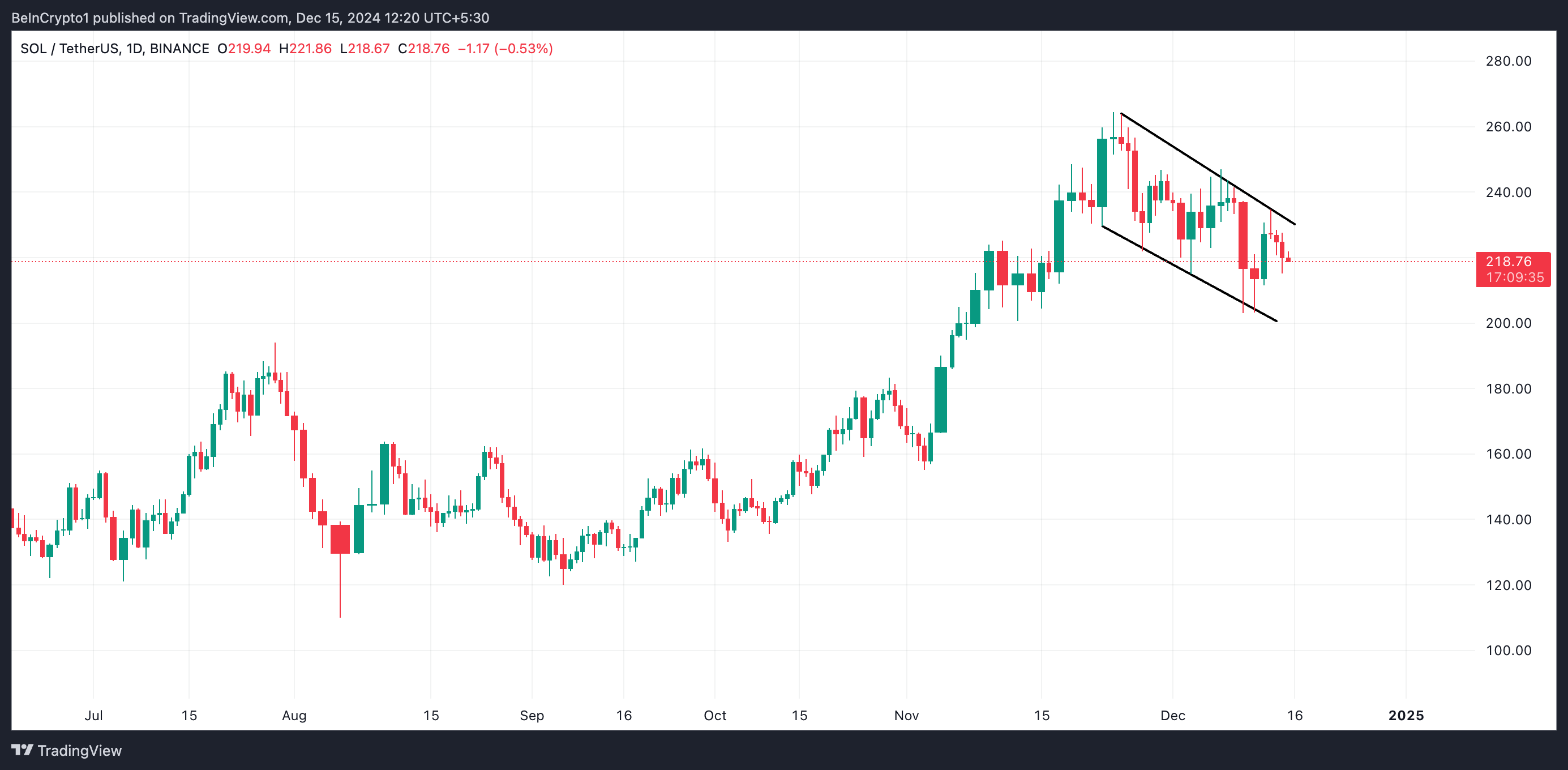 على الرسم البياني اليومي، تحرك سعر سولانا داخل قناة هابطة منذ 23 نوفمبر. تتشكل هذه القناة عندما يتحرك سعر الأصل بين خطي اتجاه متوازيين مائلين للأسفل، مما يشير إلى اتجاه هبوطي. يشير ذلك إلى أن السعر يشهد قممًا أقل وقيعانًا أقل، مما يعكس ضغط بيع مستمر.