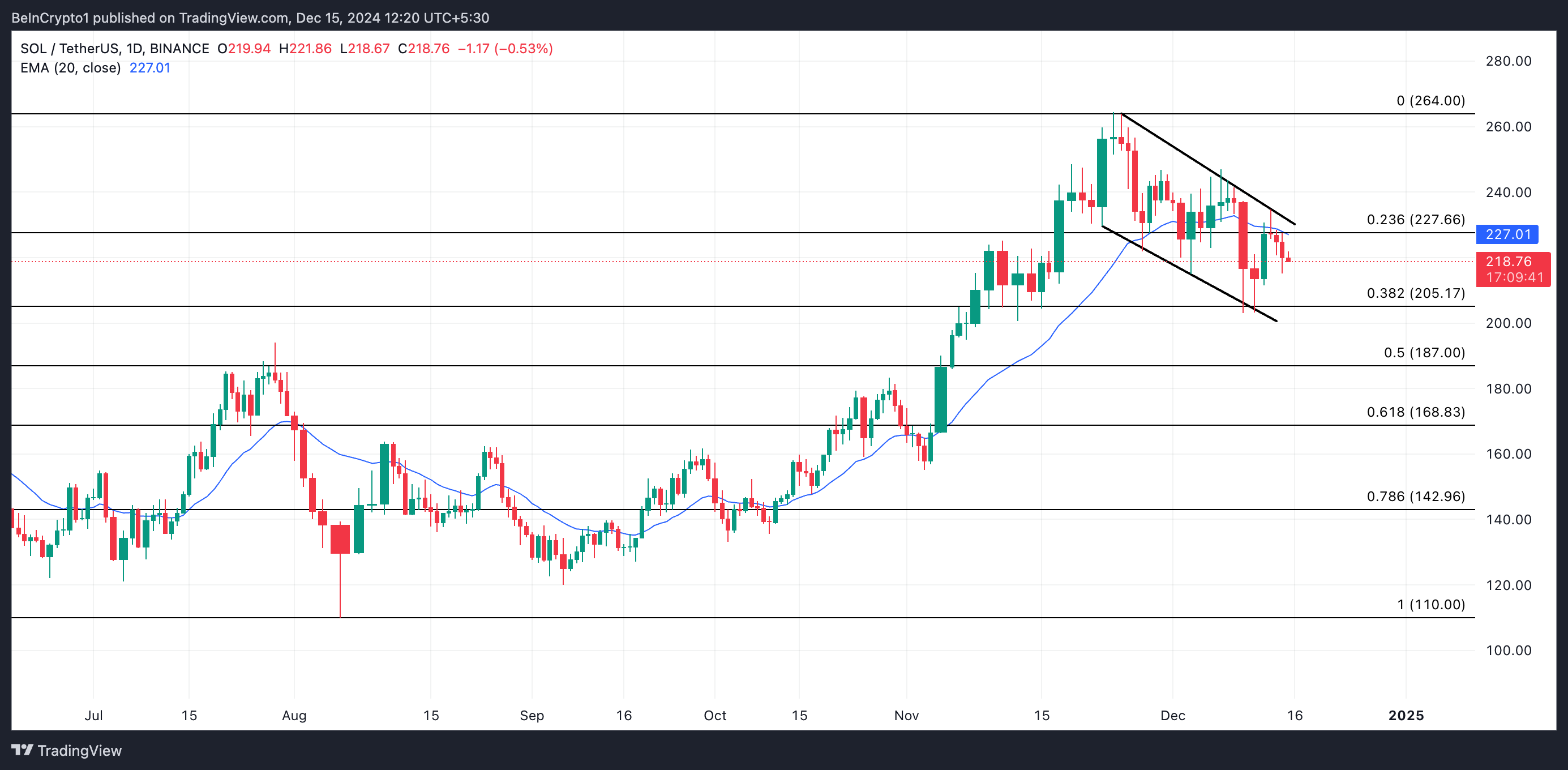ومع ذلك، إذا ارتفع الطلب، فقد يتمكن سعر عملة سول من اختراق مقاومة المتوسط المتحرك الأسي لـ20 يومًا عند $227، وتجاوز الخط العلوي لقناته الهابطة، وتوجيه أنظاره لاستعادة أعلى مستوى له على الإطلاق عند $264.