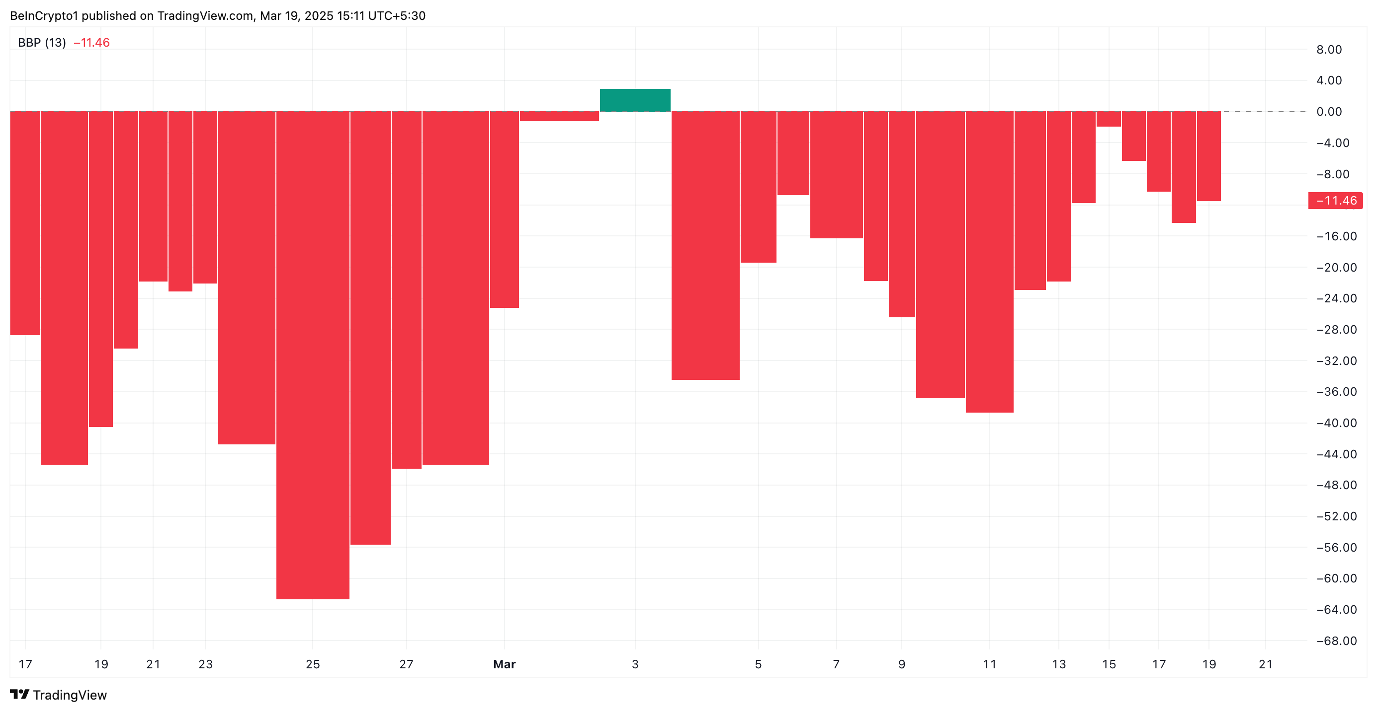 يقيس مؤشر Elder-Ray قوة المشترين (قوة الثيران) والبائعين (قوة الدببة) من خلال مقارنة أعلى وأدنى أسعار الأصل بمتوسطه المتحرك الأسي (EMA). عندما يكون المؤشر سلبيًا، فإنه يشير إلى أن قوة الدببة هي المسيطرة.