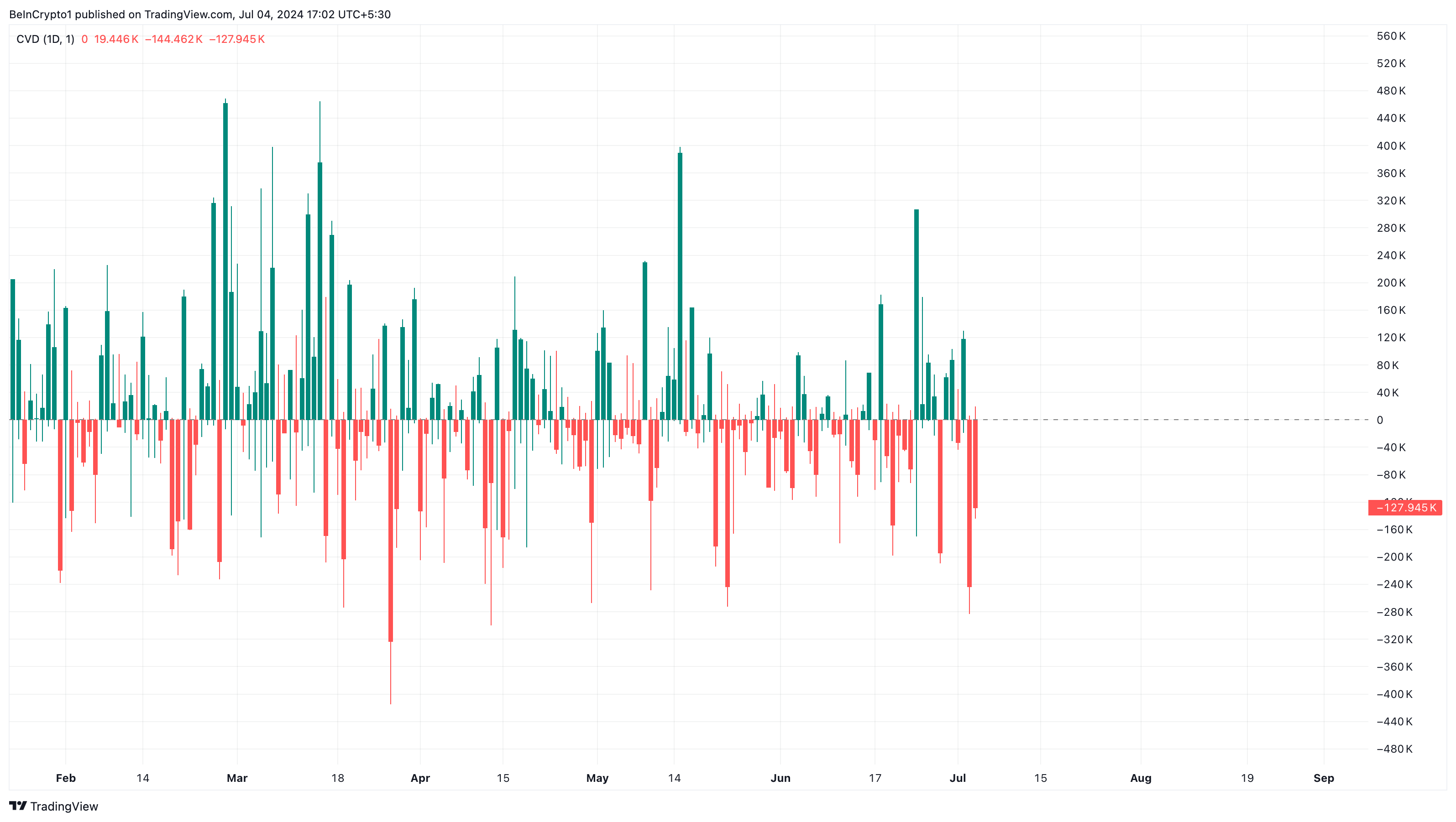 وفقًا للرسم البياني اليومي لسولانا، يبلغ CVD -127,945، مما يشير إلى أنه تم بيع أكثر من 127,000 عملة مقارنة بتلك التي تم شراؤها.